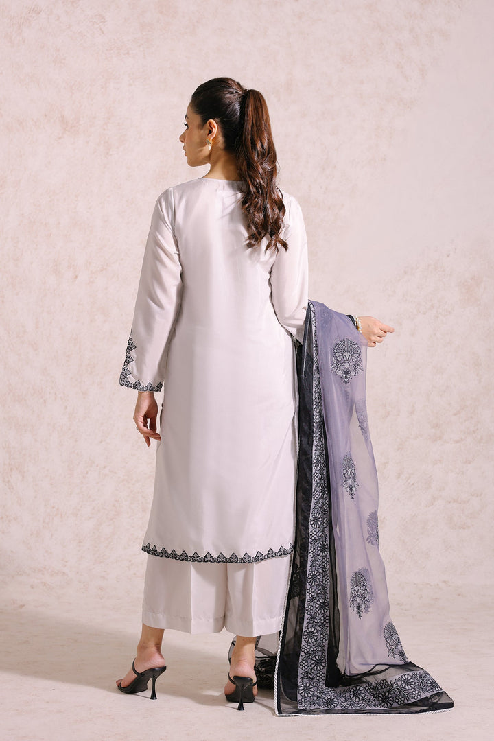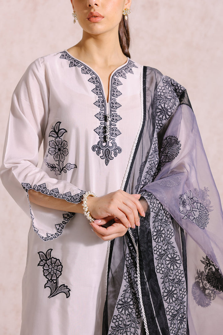 The alluring ensemble is perfect for formal occasions. It features a classy coconut milk shirt beautifully adorned with aesthetically rich designs with captivating floral motifs embroidered in contrasted deep black hues layered on an elegant silhouette that makes it a chic choice. The solid culotte trouser and a beautifully embroidered dupatta rendered in contrasted deep hues, this monochromatic outfit is a great option for day events to look sophisticated this season.