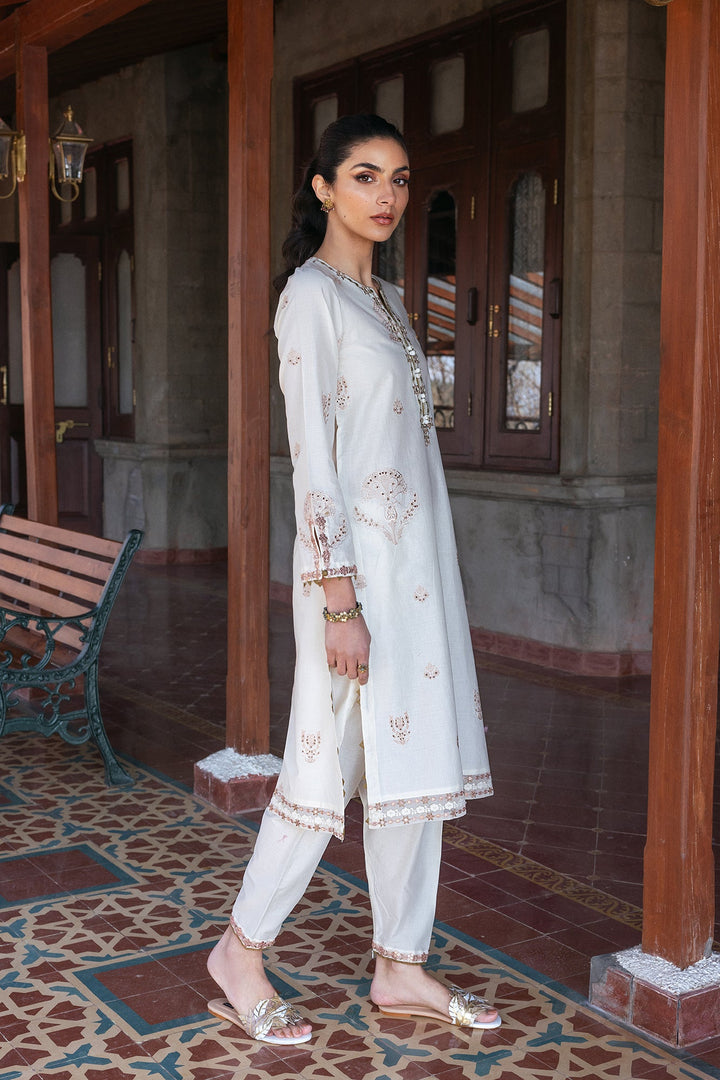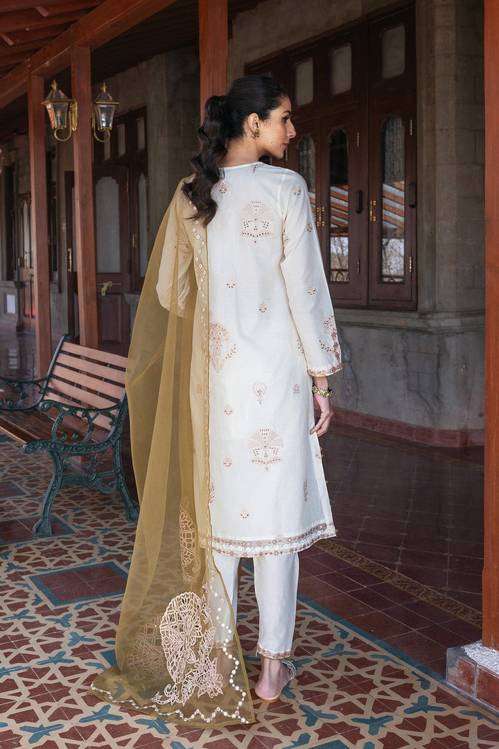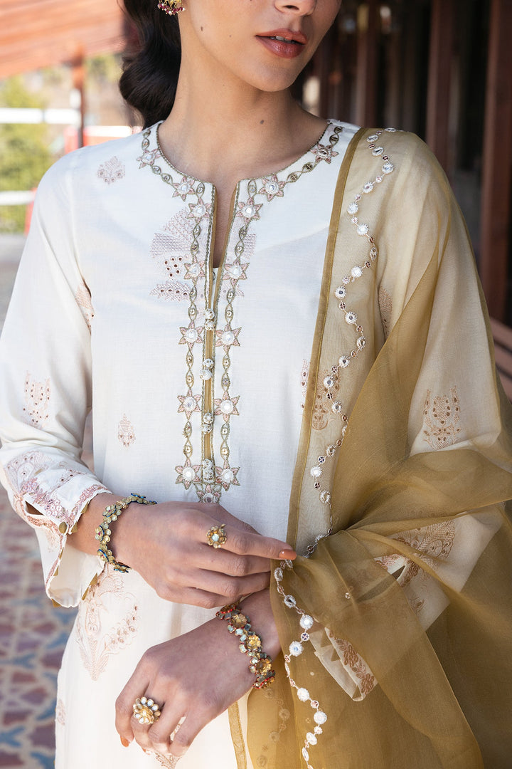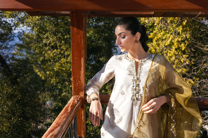 A classically rich composition is portrayed on this classy ensemble rendered in a celestial shade. It depicts a contemporary shirt enriched with aesthetically appealing floral embroidery in mesmerizing beige and olive hues with schiffli details and enhanced with delicate lace. Paired with a trendy embroidered shalwar and a gracefully draped contrasted mid olive dupatta enhanced with dazzling embroidery, this exquisite outfit is a must have to style at formal events this season.