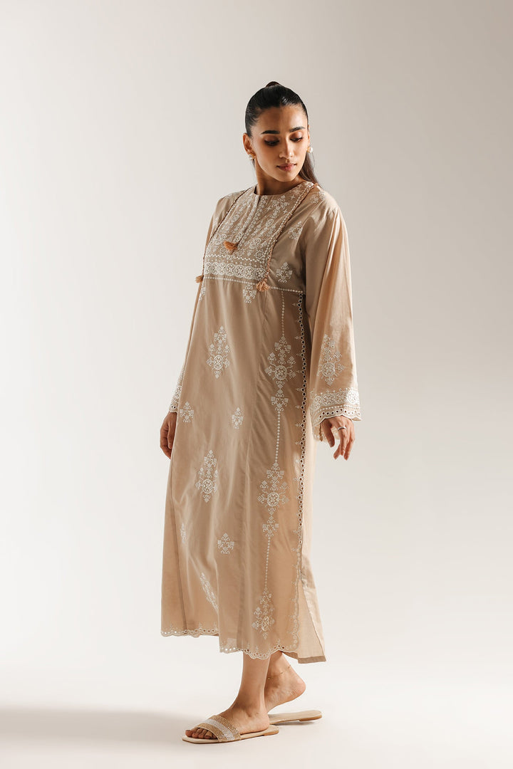 Radiate effortless elegance in this exquisite embroidered dress. Crafted from a soft, flowing fabric in a sophisticated beige hue, this maxi dress is adorned with delicate white embroidery that cascades gracefully from the bodice to the hem, adding a touch of intricate beauty. The comfortable silhouette and charming tassel detailing at the neckline complete this timeless piece, making it a versatile choice for any occasion.