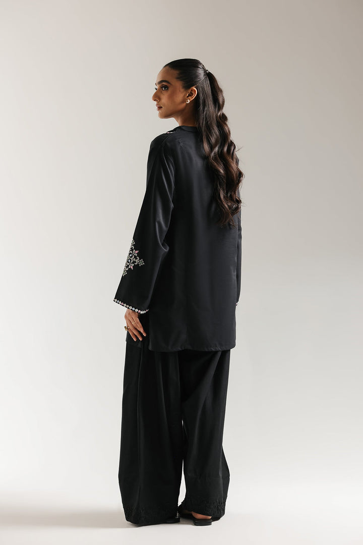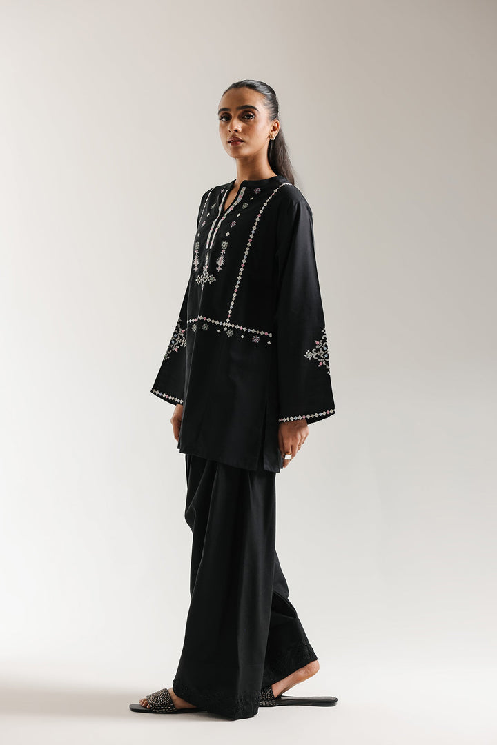Exude sophistication with this striking black embroidered kurti. This long-sleeved, straight-cut kurti is crafted from a rich black fabric. It is elegantly embellished with dense white thread embroidery in geometric patterns across the yoke and a delicate vine motif on the flared cuffs. The ban neckline with a slit adds a subtle modern touch.
