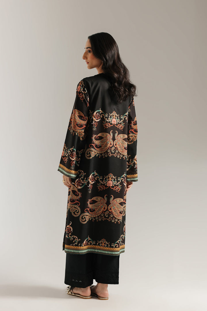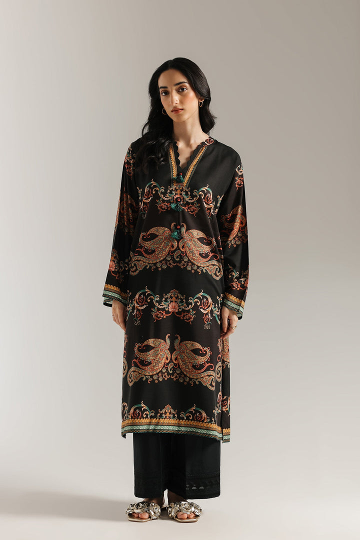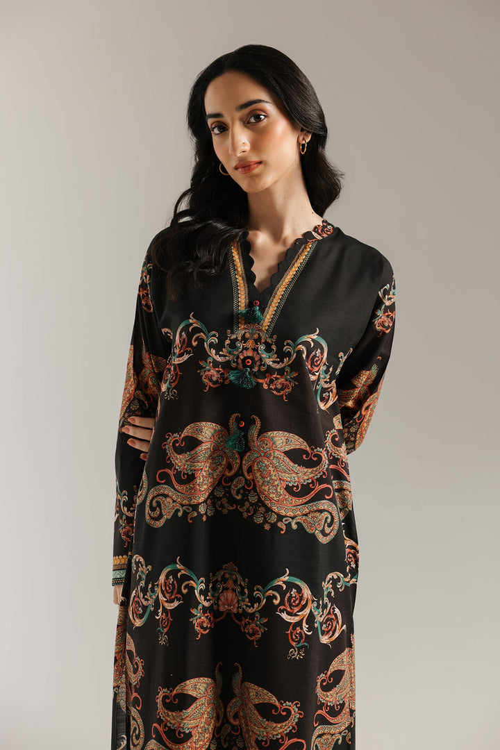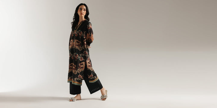 A masterpiece of sophisticated artistry. This stunning black printed kurti is adorned with an intricate ornamental and paisley print in vibrant shades of orange, green, and pink. The relaxed-fit kurti can be paired with matching black culotte trousers to create a cohesive and elegant look.