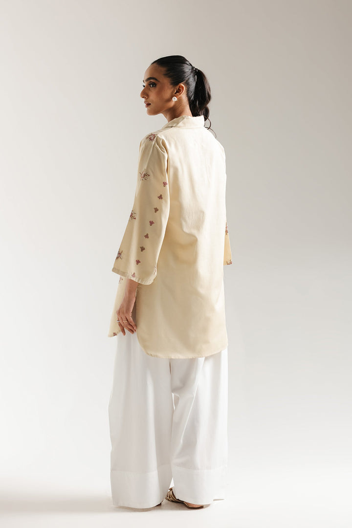 Capture serene elegance in this creamy beige embroidered kurti. This relaxed-fit kurti is crafted from a light beige fabric and features a sophisticated collared V-neckline. It is delicately adorned with scattered floral motifs embroidered in soft pink and muted green threads. The three-quarter sleeves have a gentle, wide cuff. It can be paired with crisp white wide-leg trouser, this kurti offers an effortlessly chic and timeless look for any daytime event.