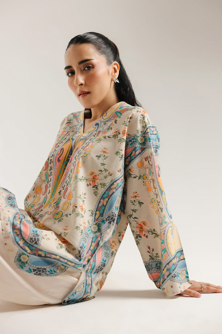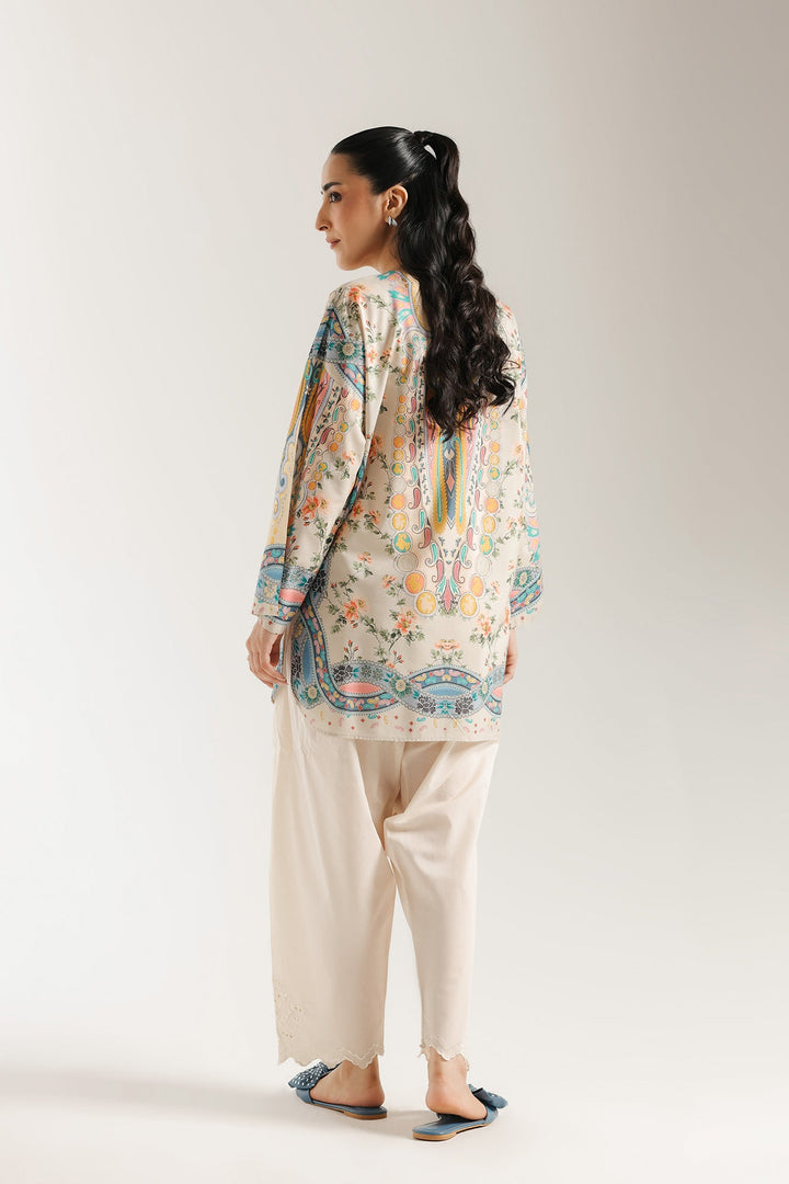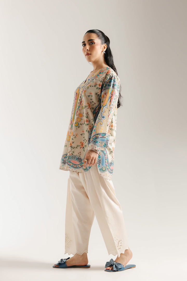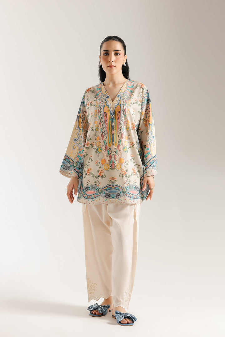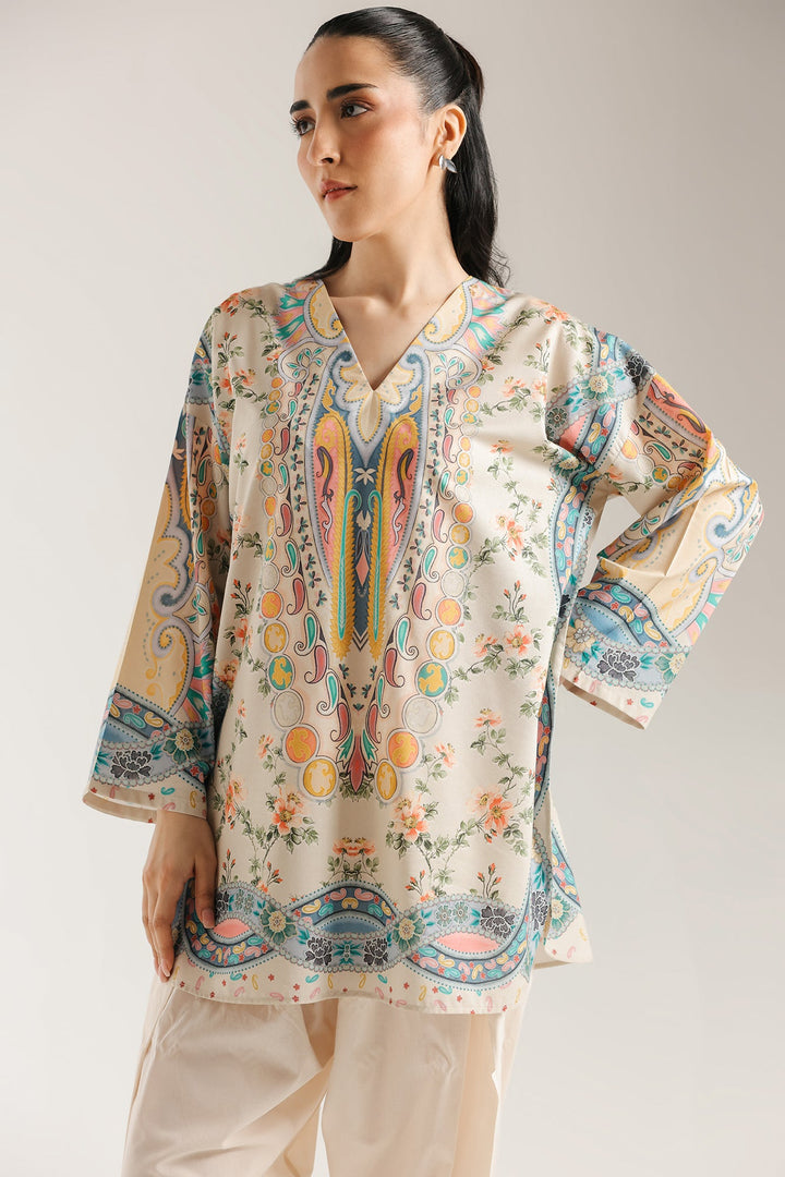 Embrace the vibrant spirit of a blooming garden. This captivating printed kurti features a light, off-white base adorned with a stunning, colorful floral and paisley print that flows down the front panel and sleeves. The delicate V-neckline is accentuated with intricate patterns, creating a beautiful focal point. The relaxed silhouette and soft colors make this kurti an effortlessly elegant choice for any occasion.