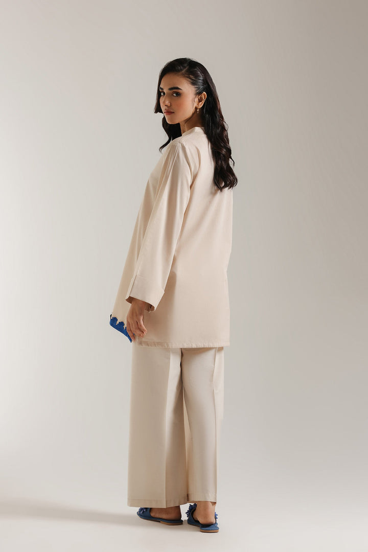 A stylish shirt with a modern silhouette. Featuring a classy sand color and intricately designed with delicate pattern embroidery on the front, showcasing beautiful artistic motifs in contrasting blue hues. A sophisticated choice for everyday gatherings during the summer season.