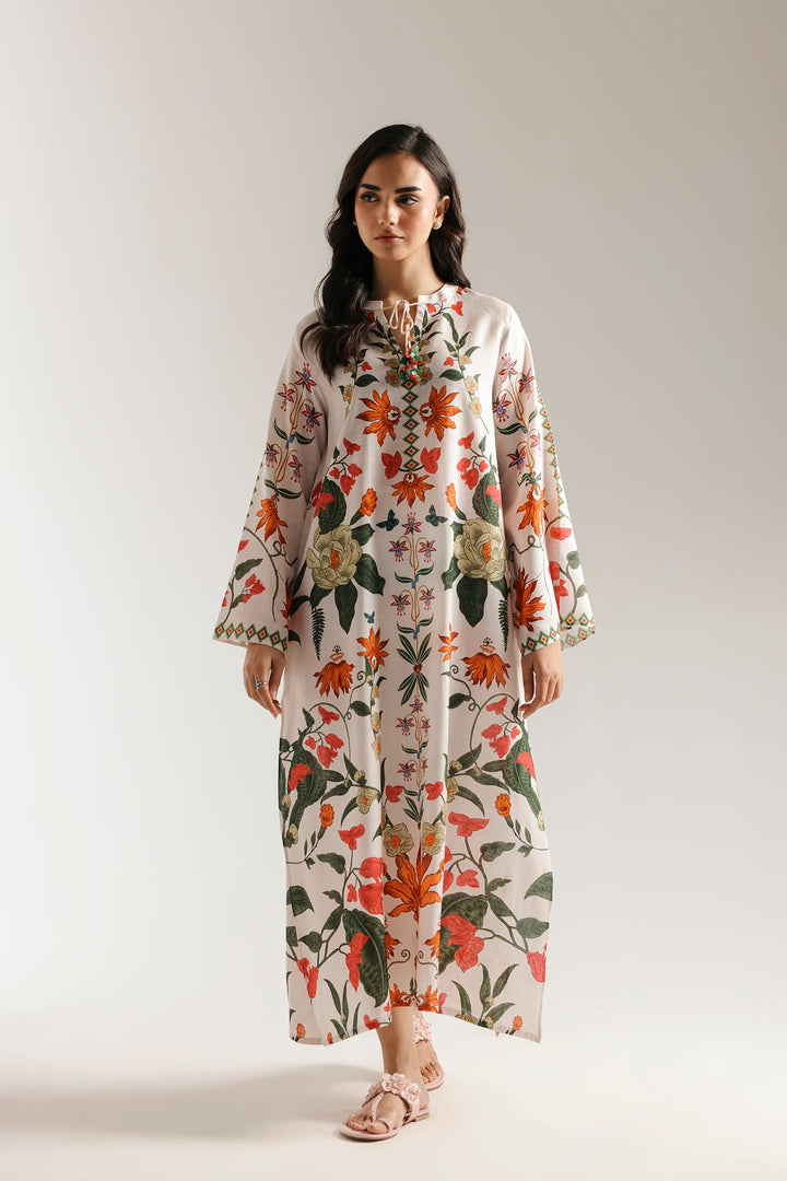 This piece is a celebration of vibrant floral artistry, showcasing a beautiful garden-inspired print with bold, blossoming flowers and intricate botanical details. The elegant long shirt, crafted from a soft, flowing fabric, offers a relaxed silhouette and graceful drape. The neckline features delicate tie-up detailing, adding a touch of bohemian charm to the classic design. Perfect for a leisurely day out or a stylish gathering, this versatile shirt brings a fresh and enchanting feel to your wardrobe.