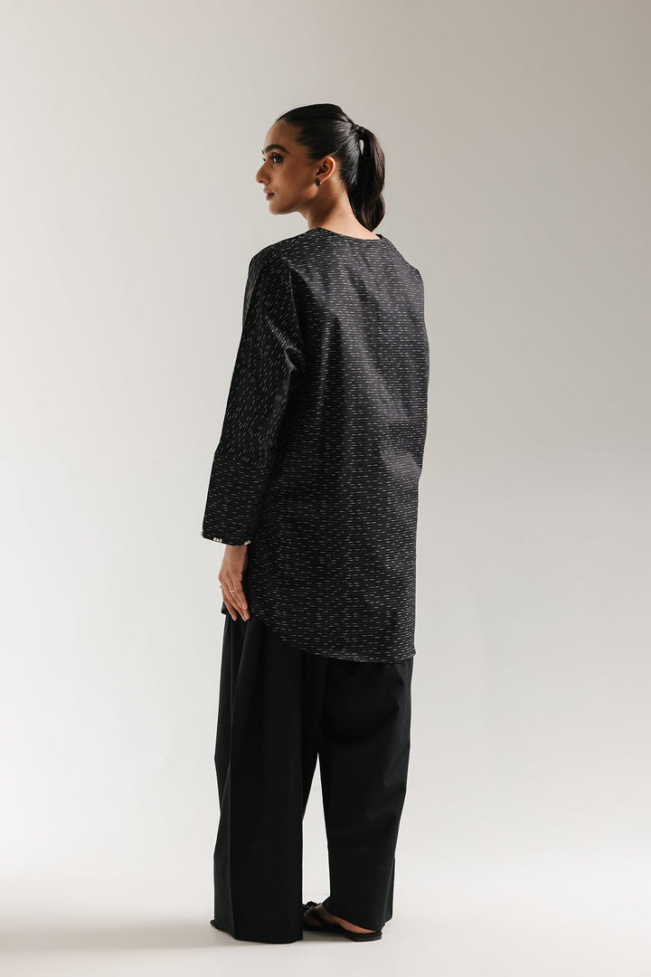 Achieve effortless sophistication in this modern black textured shirt. This comfortable, relax fit top features a simple round neckline and a subtle vertical line textured pattern in white across the black base. The design is accented by a stylized beaded tassel detail hanging from the neckline. The relaxed fit and deep black hue make this an incredibly versatile piece, perfect for pairing with wide-leg trousers or modern silhouettes for a chic daily look.