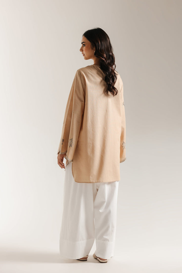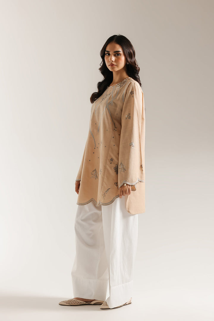Capture effortless luminosity in this elegant embroidered shirt. This short, relaxed-fit shirt is crafted from a soft, nude/pale gold fabric. It features delicate silver-toned thread embroidery in a light floral and scroll pattern across the yoke and scattered over the body. The round neckline is finished with subtle button detailing, while the shirt's hemline is beautifully accented with a scalloped cutwork border.