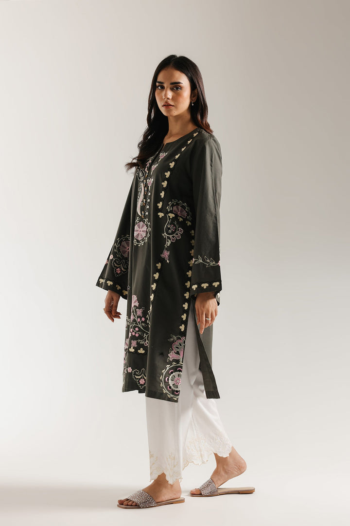 Wrap yourself in this olive-green embroidered shirt. This long, straight-cut shirt is crafted from a deep olive-green fabric. It features beautiful, intricate thread embroidery in delicate pink, mauve, and white floral patterns that elegantly trace the front, hem, and sleeve cuffs. The round neck with slit is accented with subtle button detailing.