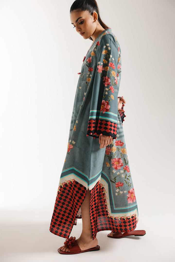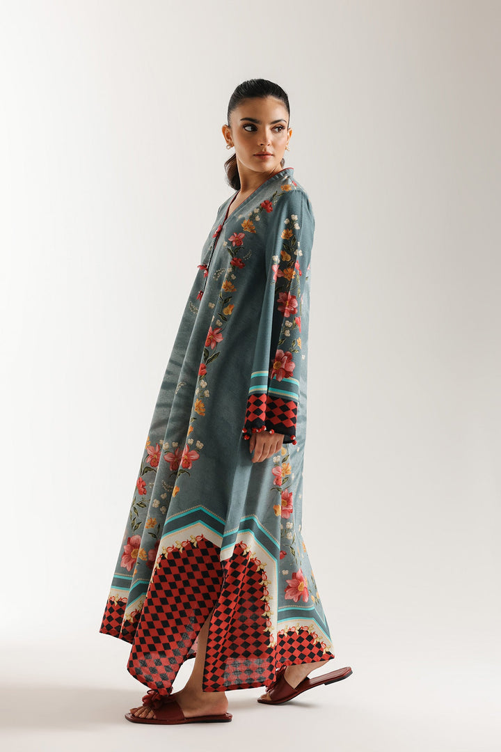 Harness the beauty of a garden with this chic blue printed shirt. The long, loose fit shirt is rendered in a soft, dusty blue fabric with a gentle, subtle self-print. It is beautifully adorned with an intricate all-around border print featuring large, detailed roses in shades of red, coral, and yellow, tracing the hemline, front panels, and sleeves. The design includes a flattering V-neckline with decorative accents and comfortable long sleeves with flared cuffs. Black and red geometric print is incorporated into the border prints, adding a contemporary touch to the traditional floral motif.