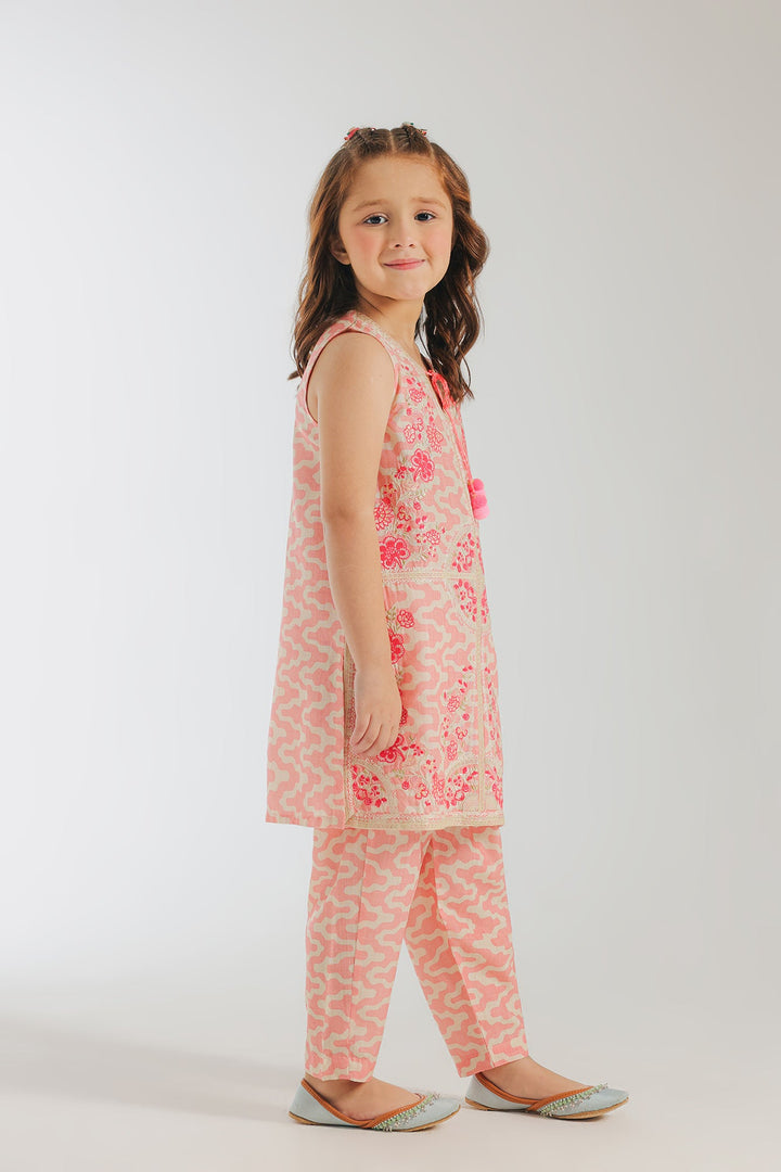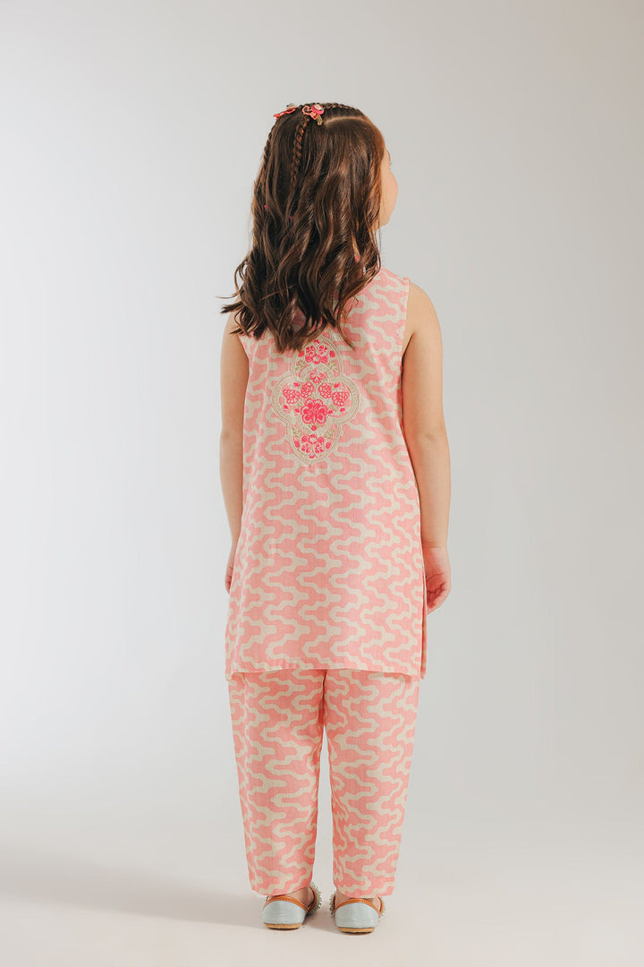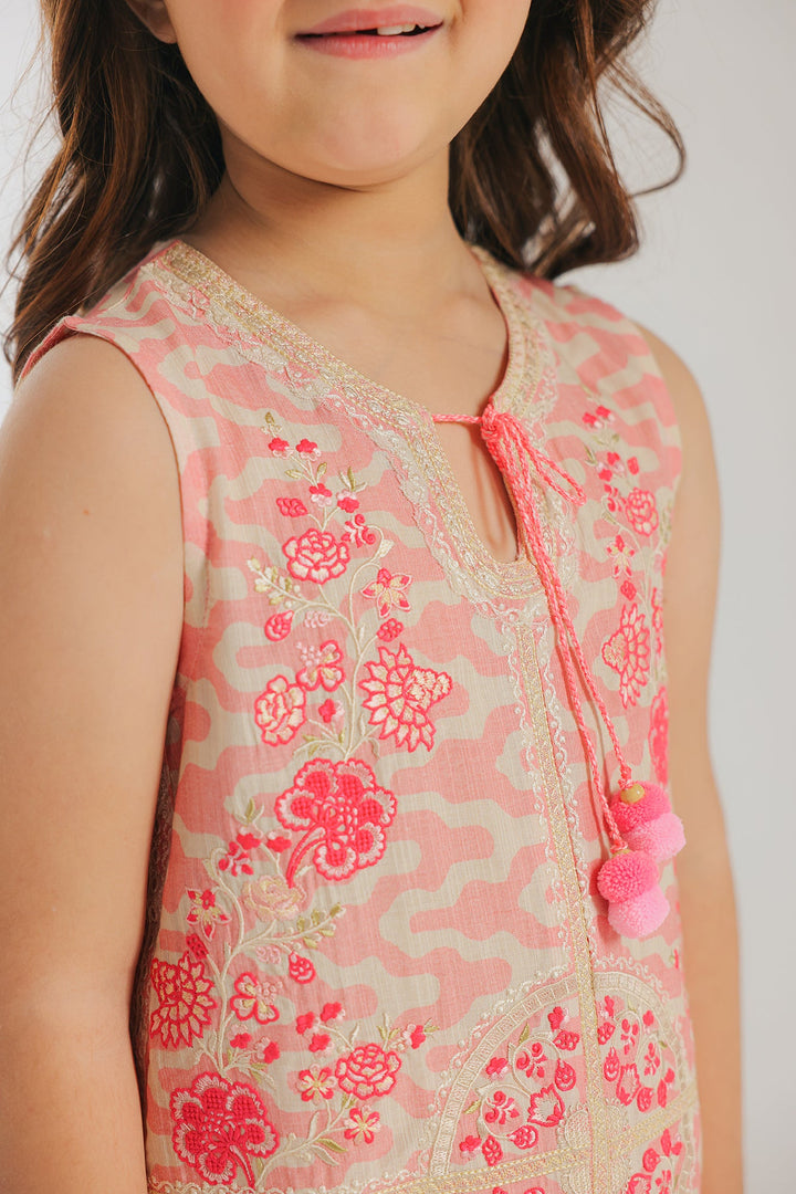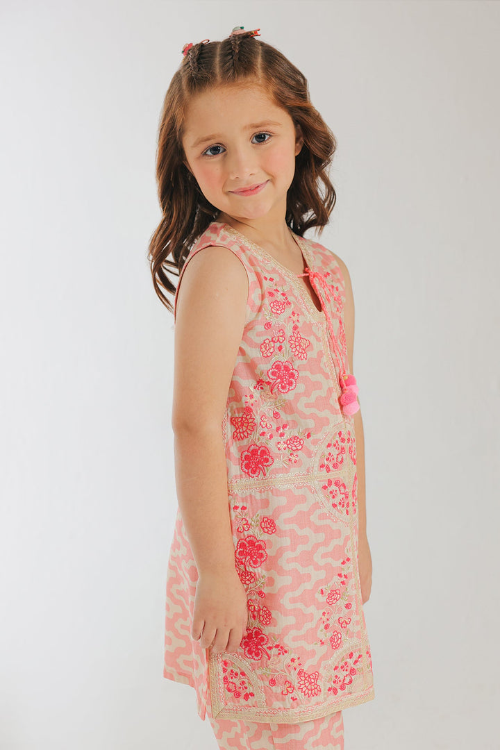 A contemporary composition crafted in a trendy silhouette sleeveless shirt beautifully adorned with captivating floral designs embroidered in vibrant colors illustrating traditionally rich elements layered on an attractive printed canvas. Paired with a trendy printed trouser, this style statement outfit is a perfect option for your girls to embrace at everyday occasions.