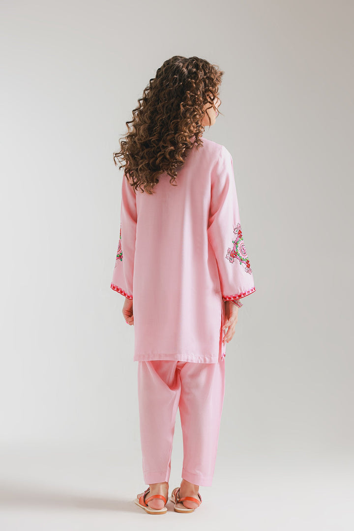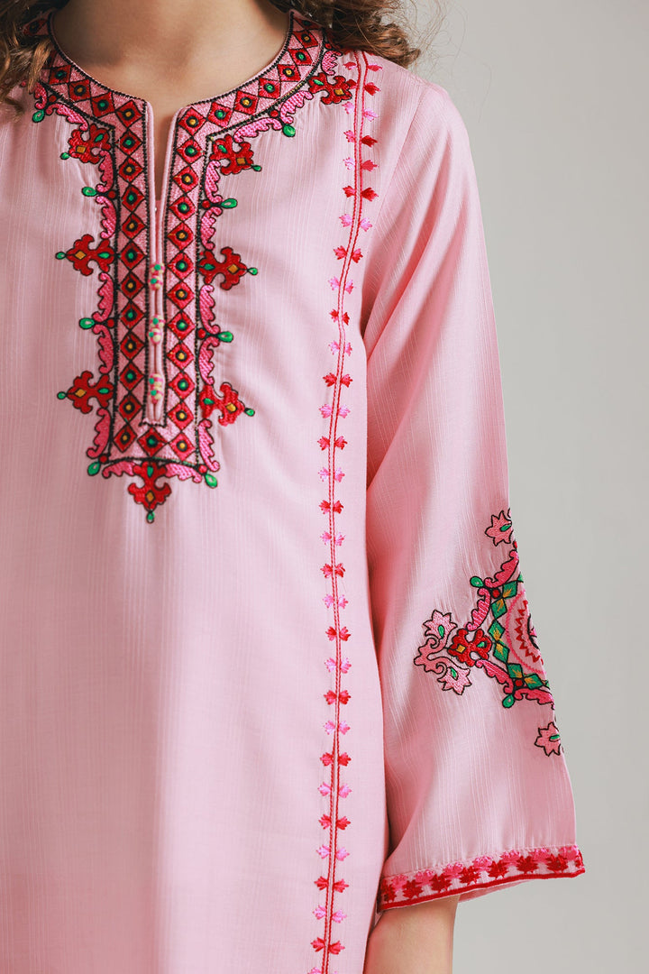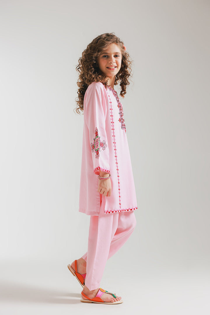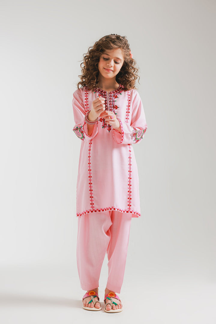 A contemporary composition crafted in a trendy silhouette shirt beautifully adorned with captivating floral designs embroidered in vibrant colors and illustrating a traditionally rich composition. Paired with a solid shalwar, this style statement outfit is a perfect option for your girls to embrace this spring season.