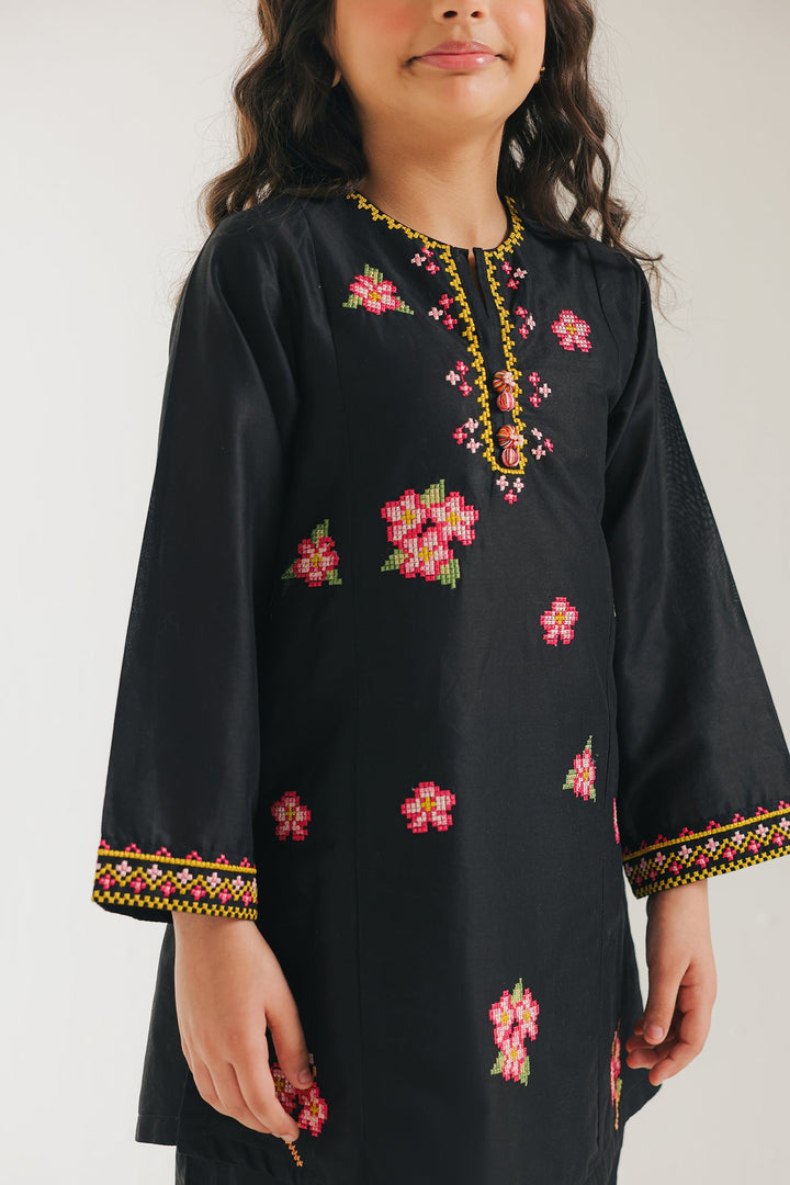 A contemporary composition crafted in a trendy silhouette shirt beautifully adorned with captivating floral designs embroidered in vibrant colors illustrating traditionally rich elements. Paired with a classy solid shalwar, this style statement outfit is a perfect option for your girls to embrace at fun occasions.