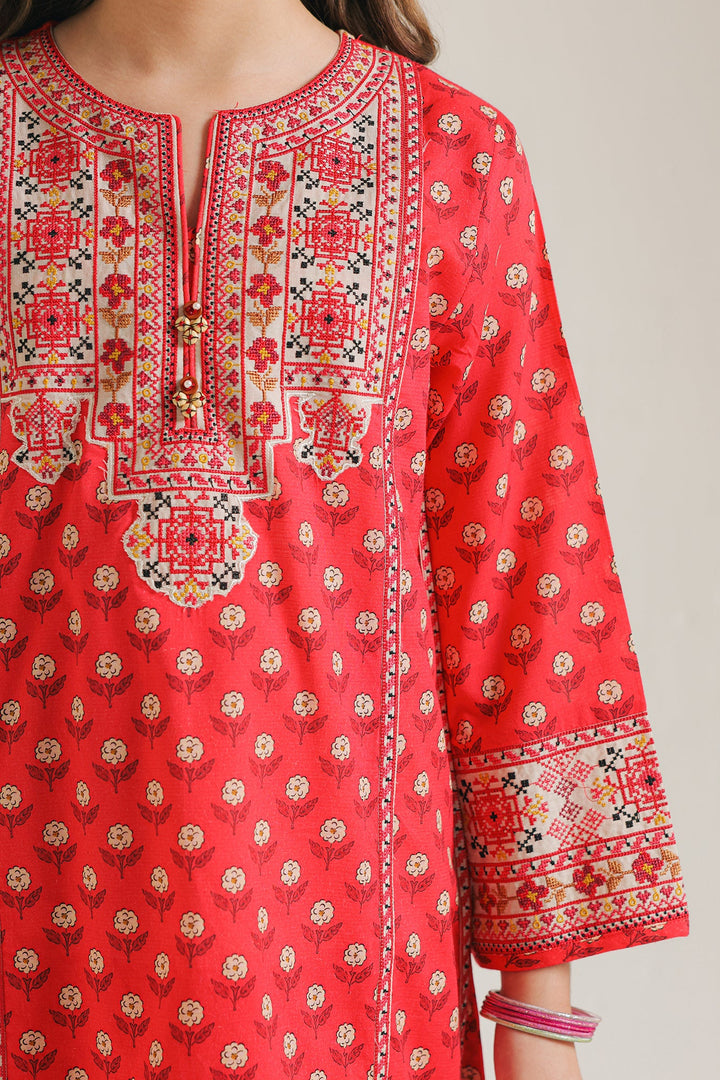 This two-piece set, is perfect for adding a pop of color and charm to any occasion. The rich ruby hue of the tunic serves as a striking backdrop for the intricate floral and geometric patterns that adorn the neckline, sleeves, and the overall design. Paired with matching trousers in the same vibrant hue, create a coordinated yet stylish look.