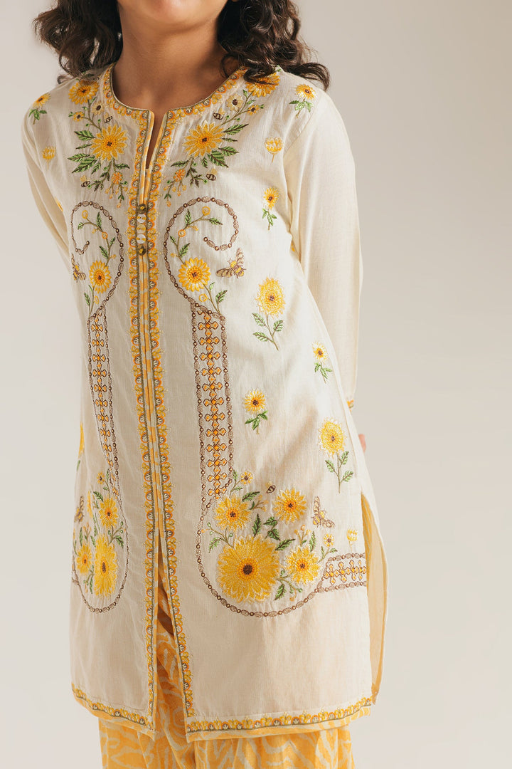 A cheerful and elegant suit that is a celebration of vibrant color and traditional design. The off-white tunic is a canvas for stunning yellow floral embroidery, beautifully arranged along the front and sleeves. The look is completed with comfortable shalwar in a matching yellow and white print, creating a perfectly coordinated and joyful ensemble.