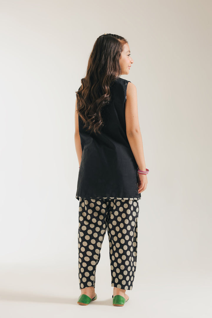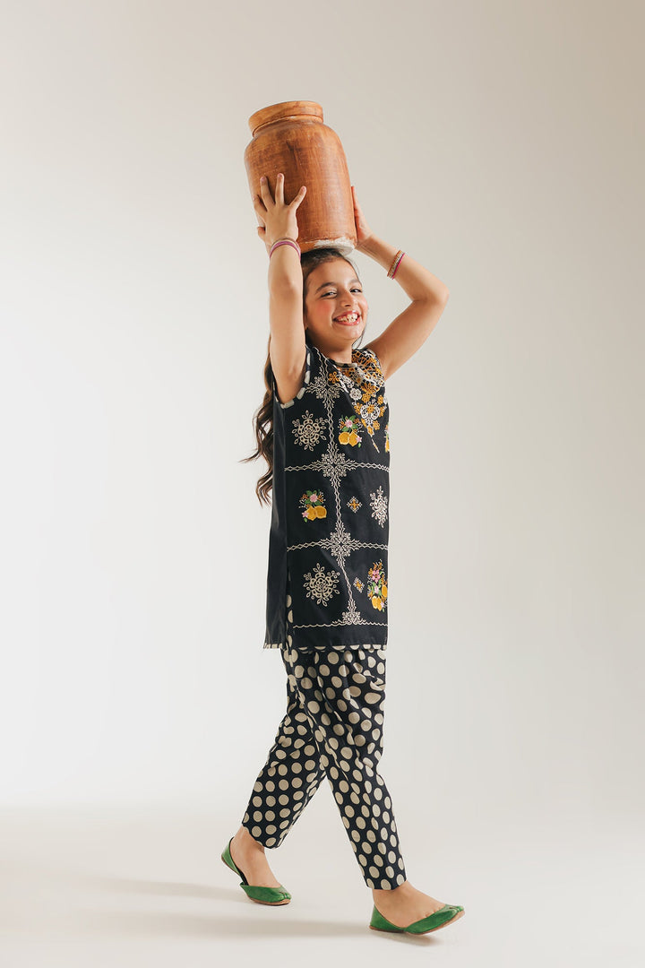 Let your little one twirl in this ensemble, a canvas for her vibrant spirit. This timeless black kameez features a sleeveless design that blossoms with intricate embroidery, a captivating tapestry of golden threads and sunny floral motifs dancing across the rich black backdrop, where delicate white accents add a touch of ethereal grace. Complementing this is the playful polka dot shalwar, a contrasting pattern that creates a modern twist, perfect for the little trendsetter who loves to stand out