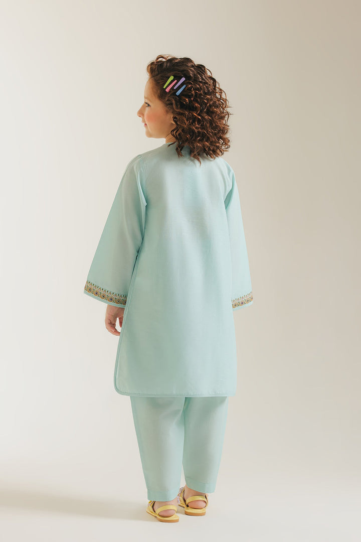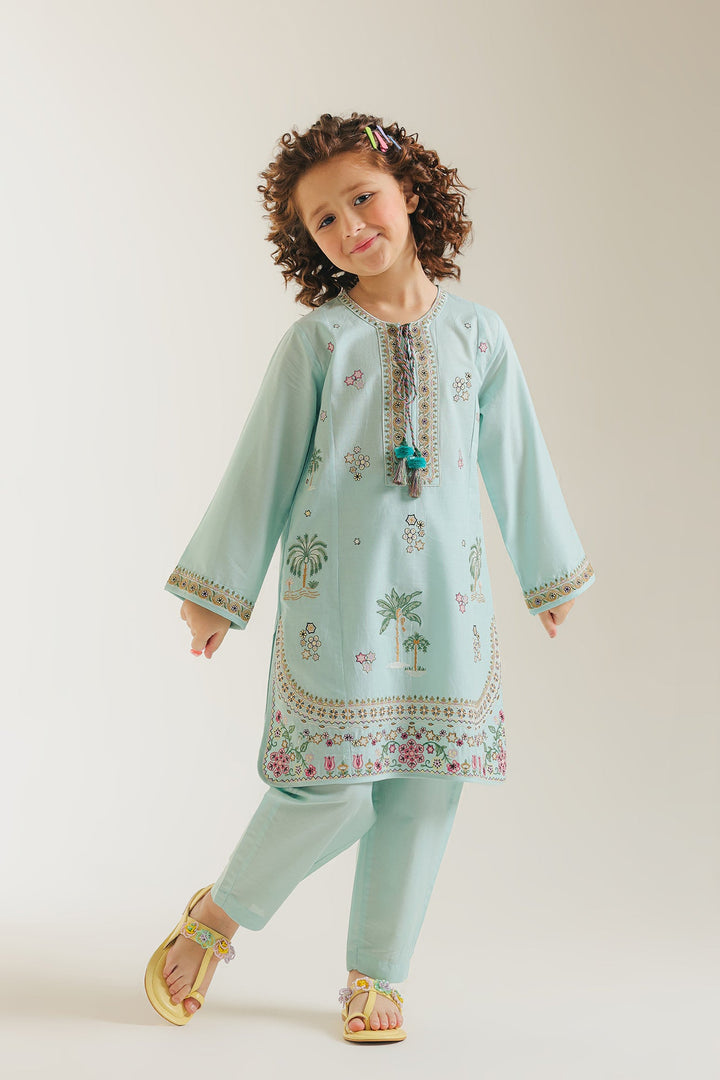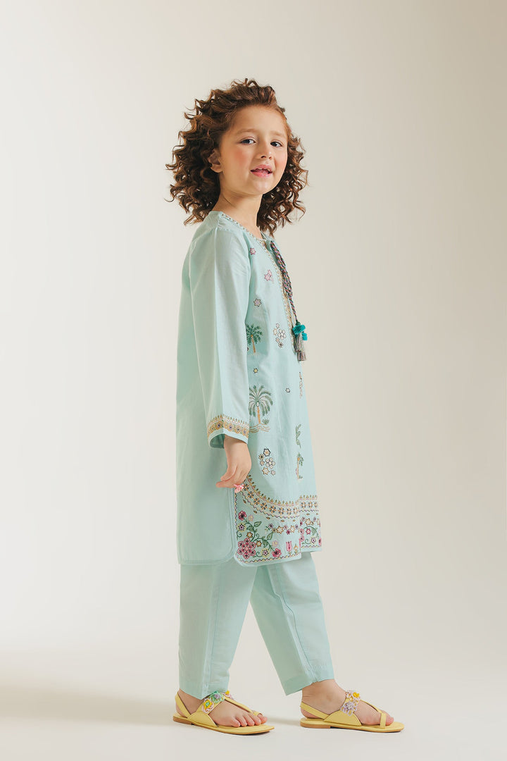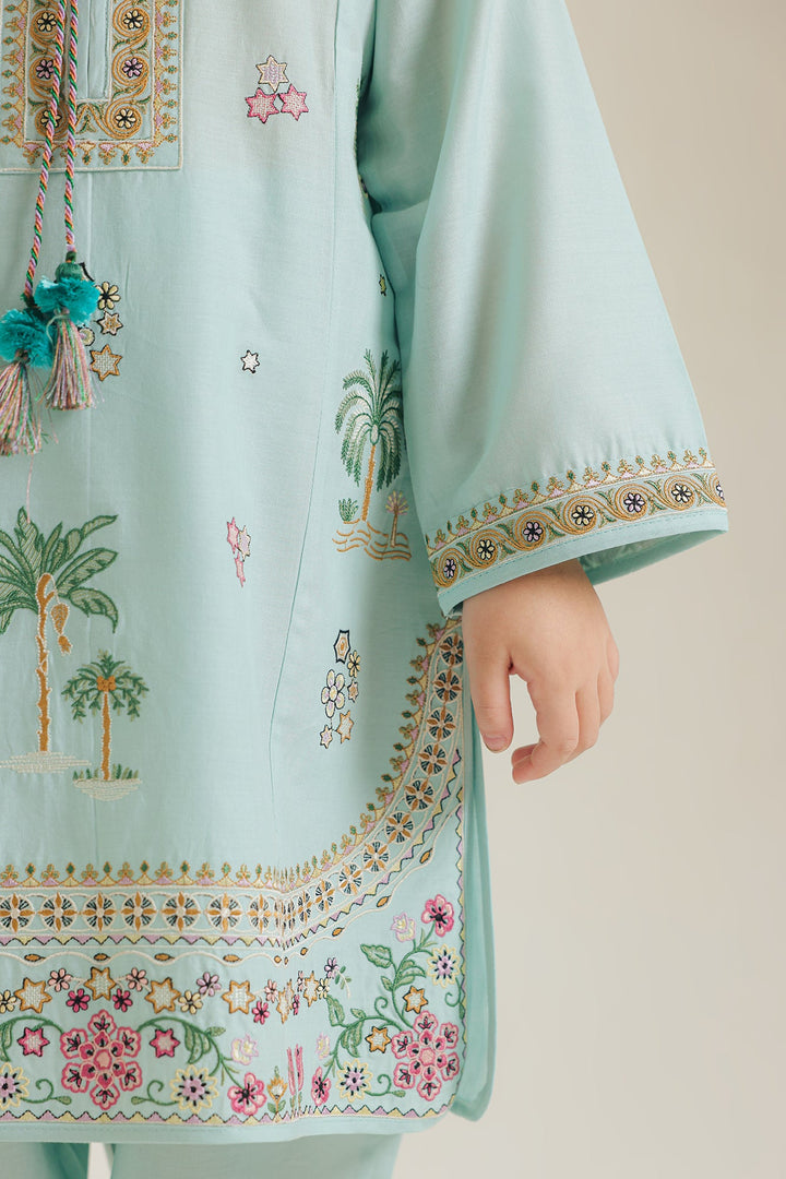 Let her imagination bloom in this enchanting embroidered kids kurta set, a delightful ensemble perfect for any young dreamer. The serene aqua green kurta is a canvas of intricate charm, featuring delicate floral vines and charming palm tree motifs subtly embroidered across the front and sleeves. The round neckline is adorned with a detailed placket and playful tassels, adding a touch of whimsy. A beautifully embroidered border graces the hem, completing the traditional look. Paired with comfortable matching shalwar, this set ensures she stays both stylish and at ease during festive gatherings, family events, or simply while exploring her world.