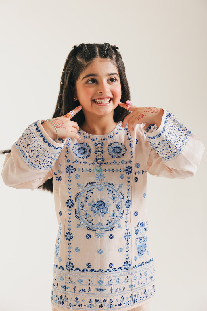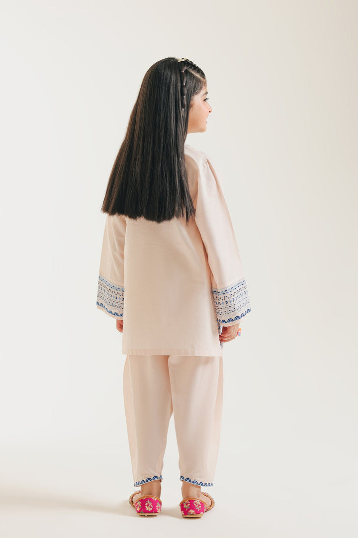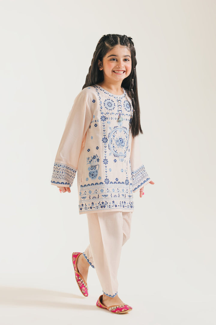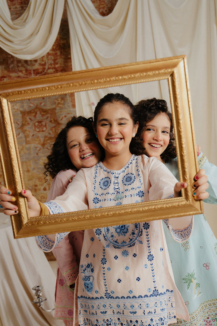 Embrace serene elegance with our stunning blue embroidered peach two-piece set! This delightful outfit features a soft, pale coral hue, lavishly adorned with intricate blue embroidery across the front and wide sleeves. The detailed floral and medallion patterns create a sophisticated and harmonious design. Paired with comfortable matching shalwar, this set is perfect for festive occasions, cultural events, or adding a touch of traditional grace and comfortable style to her wardrobe.