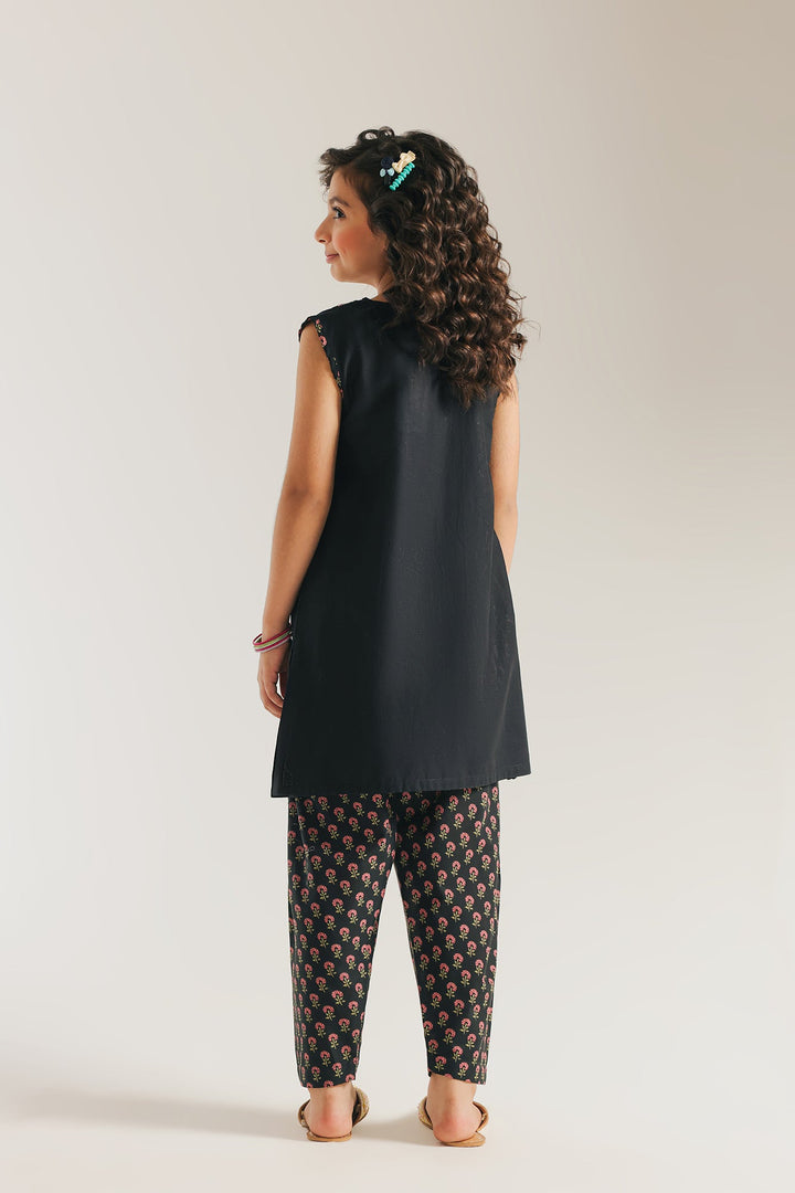 A charming and elegant sleeveless suit that blends traditional elegance with playful details. The black tunic is a canvas for intricate embroidery, featuring a beautiful combination of floral and paisley motifs in delicate shades of pink and green. The look is completed with comfortable shalwar in a matching black fabric with a complementing floral print, creating a perfectly coordinated and charming ensemble.