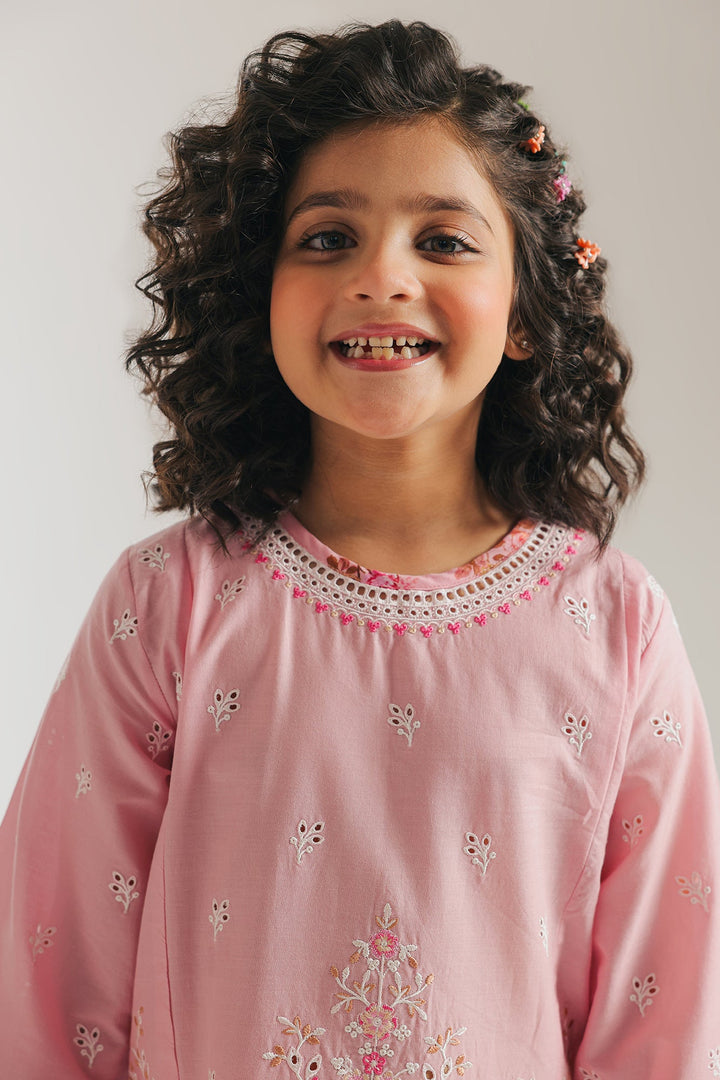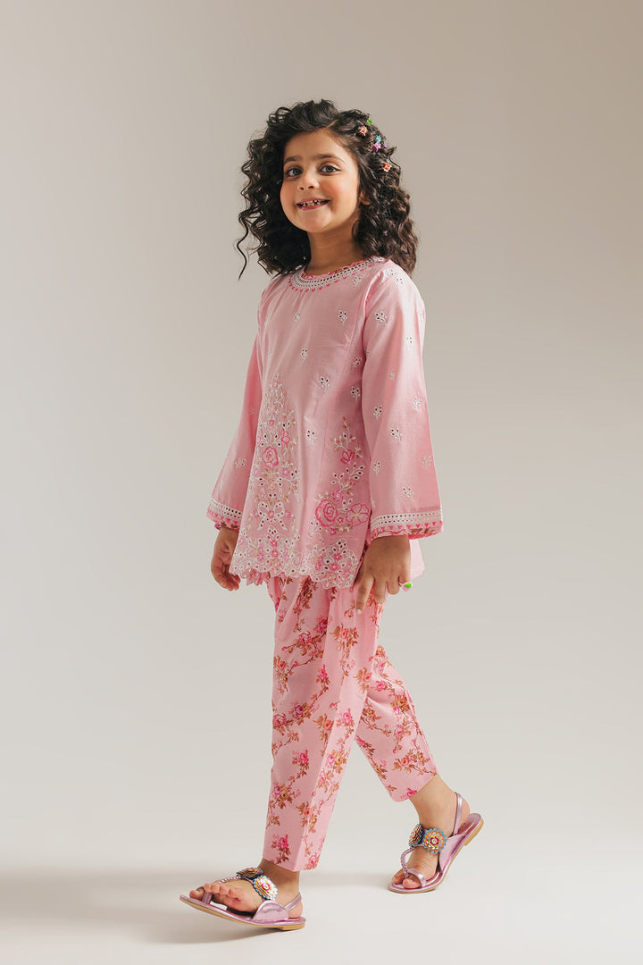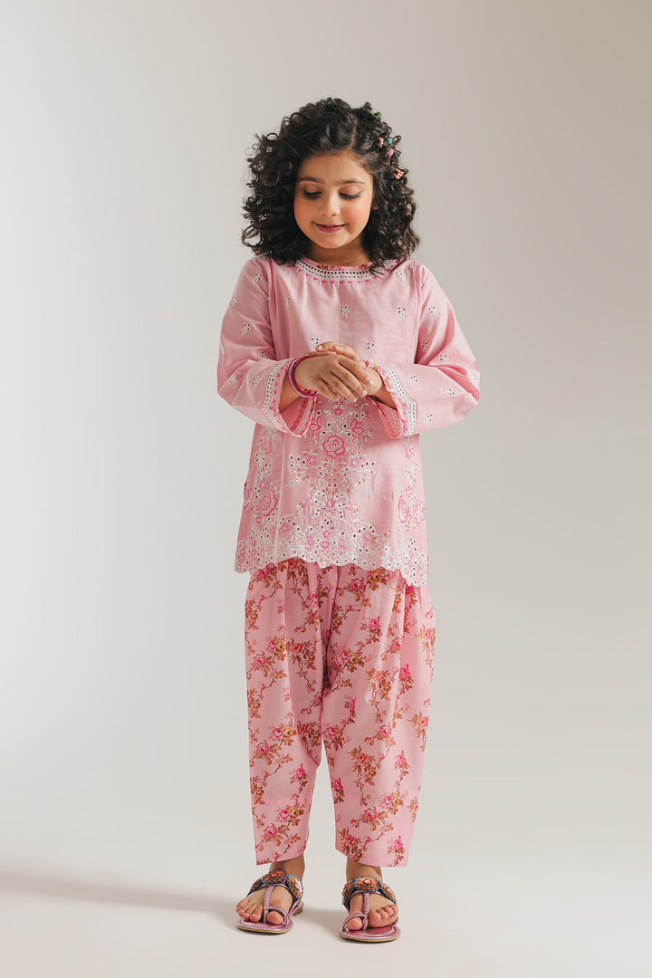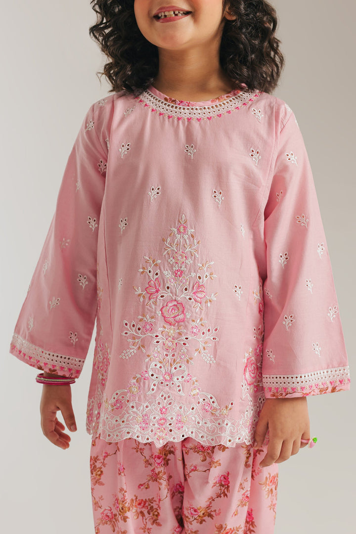 Embrace soft elegance with this enchanting pink suit. The kurta showcases exquisite white embroidery and delicate cutwork along the hem and sleeves, adding a touch of timeless grace. Paired with coordinating shalwar featuring a subtle floral print, this outfit is perfect for celebrations or simply feeling like a little princess.