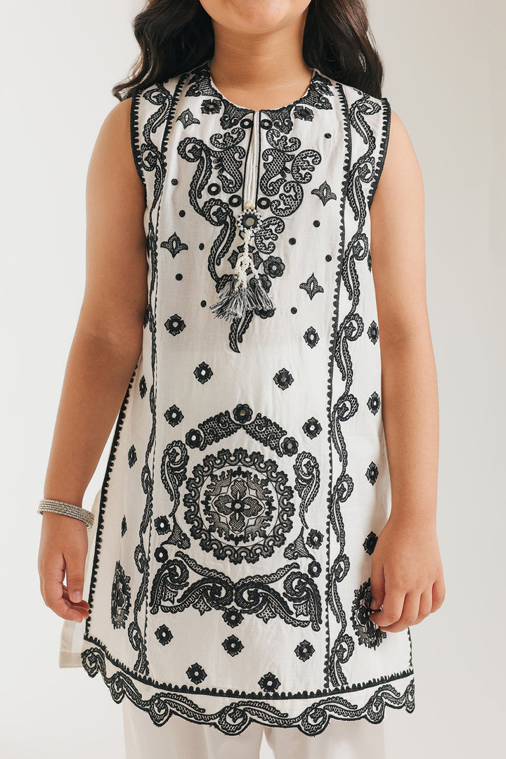 Dress her in timeless elegance with this delightful two-piece ensemble, a perfect blend of comfort and traditional artistry. The crisp white sleeveless kurta is exquisitely adorned with intricate black embroidery, showcasing ornate floral and geometric patterns across the bodice and hem, creating a sophisticated contrast. It is perfectly complemented by coordinating white shalwar, also featuring matching black embroidery along the hem, completing a cohesive and graceful silhouette. This outfit is ideal for festive gatherings, cultural events, or adding a touch of classic charm to her look.