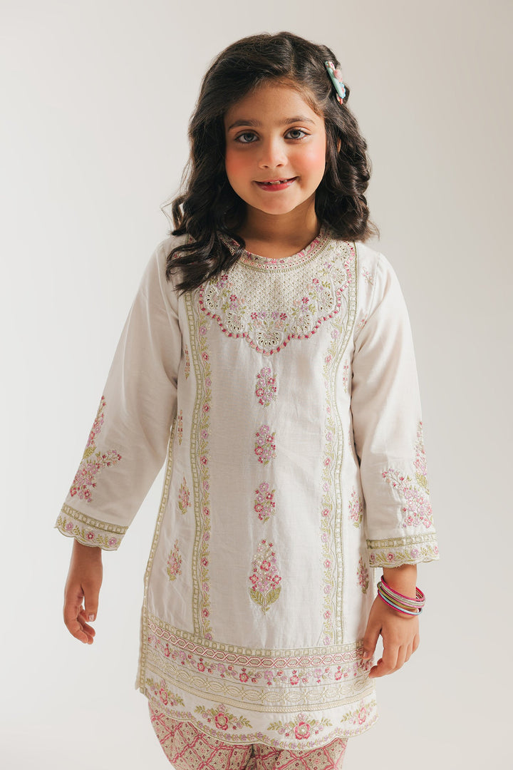 A delightful blend of traditional charm and modern comfort, this two-piece outfit is perfect for your little one. The white tunic is adorned with intricate pink and green floral embroidery, adding a touch of delicate artistry. This charming shirt is perfectly complemented by a matching printed shalwar in a soft pink and white pattern, creating a coordinated and stylish ensemble.