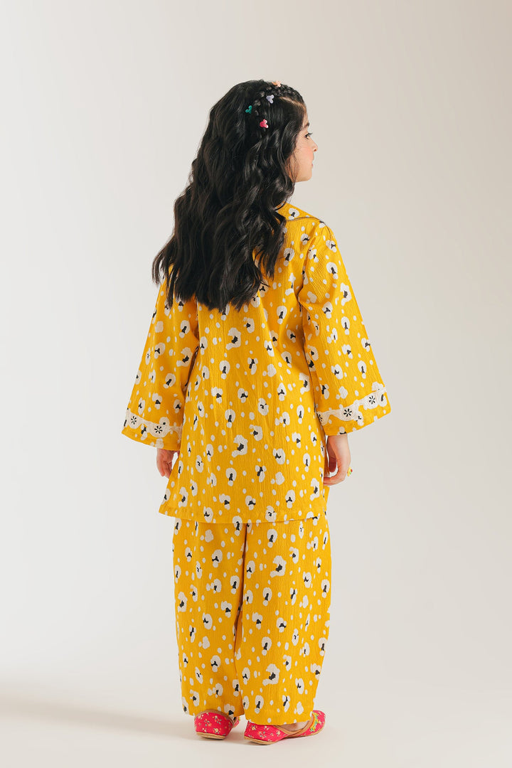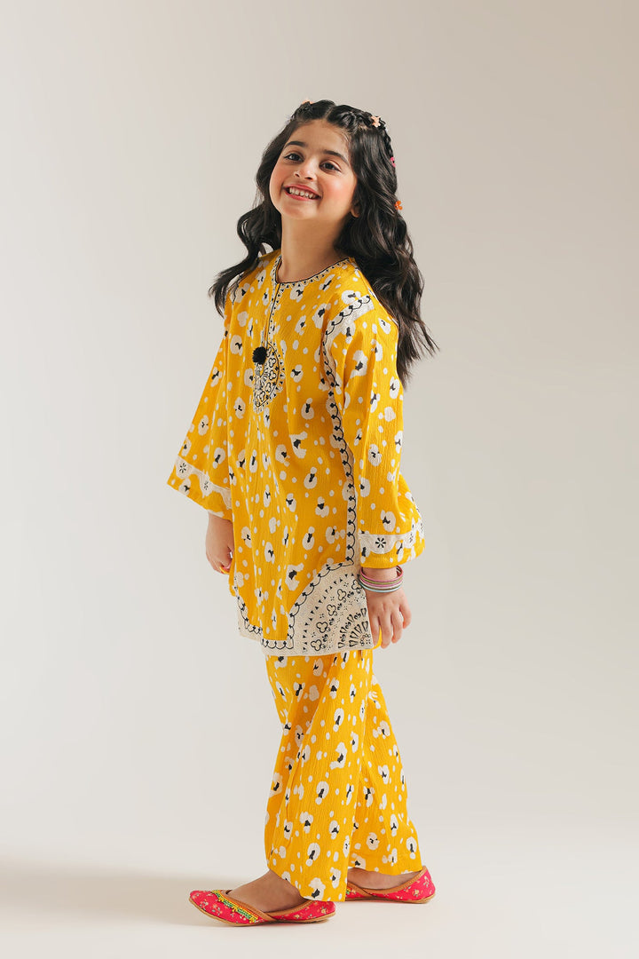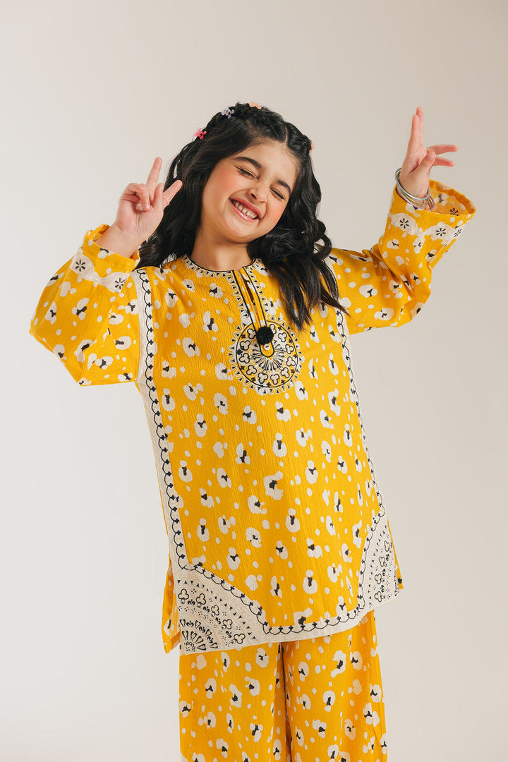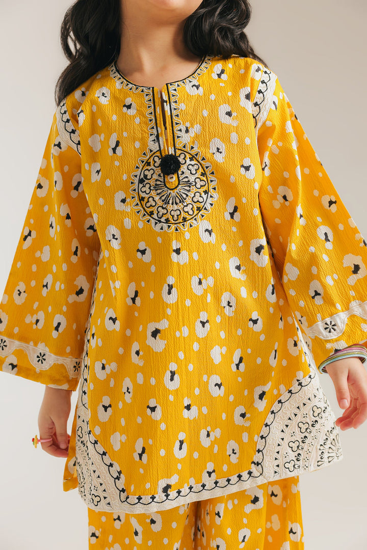 Step into a burst of sunshine with this cheerful suit, a masterpiece of playful print and intricate detail. The vibrant yellow fabric is adorned with a lively all-over print in crisp white and black, creating a sense of dynamic energy. The neckline is beautifully accented with delicate embroidery and charming tassels, adding a touch of artisanal flair. Contrasting embroidered panels on the sleeves and hem provide a striking finish, making this ensemble a perfect blend of comfort and style for your little one.