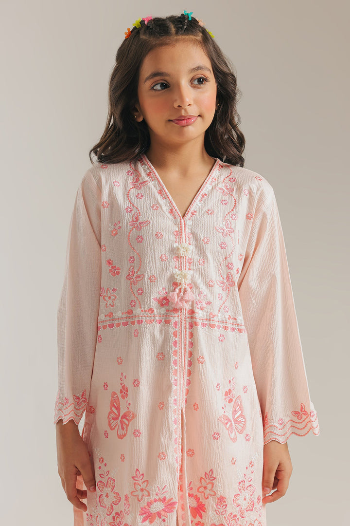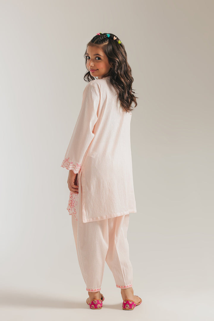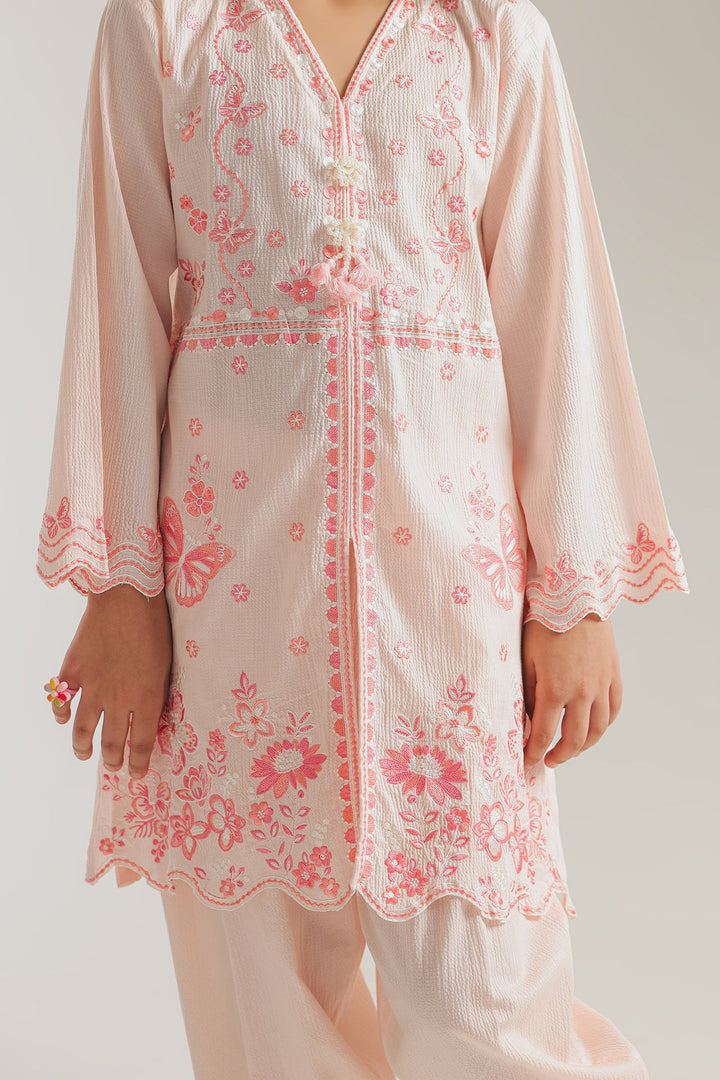 Adorn your little one in this charming blush pink outfit. The kurta features delicate pink embroidery of butterflies and floral vines, with a playful tassel at the V-neck. Paired with perfectly coordinated solid shalwar with embroidered hem. This set is as adorable as it is comfortable, ideal for delightful everyday wear.