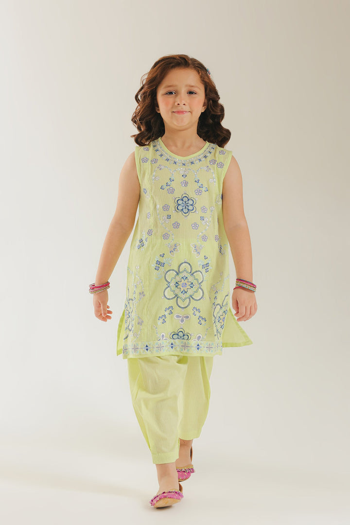 Adorn your little one in the vibrant charm of this light lime green embroidered suit. The sleeveless kurta is beautifully embellished with detailed blue and white floral and circular embroidery across the front, creating a cheerful, playful pattern. The ensemble is perfectly completed with matching shalwar in a subtly textured, solid lime green, creating a fresh, light, and charming look for spring and summer occasions.