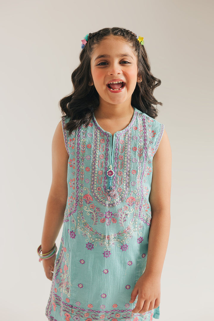 A vision of fresh and breezy style, this charming two-piece outfit is perfect for sunny days. The sleeveless light blue tunic is adorned with delicate, light pink and white floral embroidery, creating a look of sweet elegance. The outfit is completed with comfortable, solid light blue shalwar, making for an effortlessly coordinated and delightful ensemble.