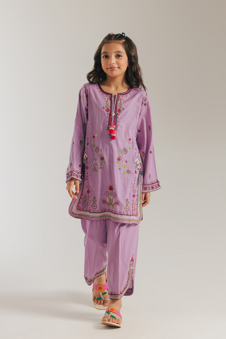 Discover the unique beauty of this captivating lavender outfit. The kurta boasts intricate embroidery of colorful flowers and winding vines, with a playful tassel accent. Paired with coordinating printed trousers, this charming set offers a distinctive and whimsical look for their day out.