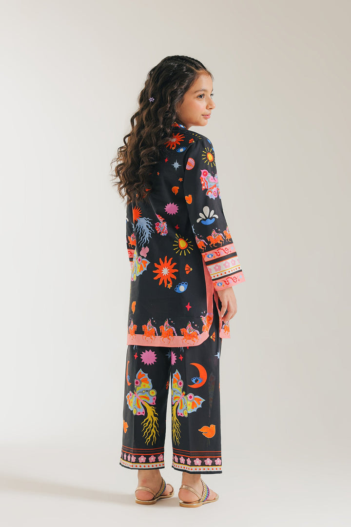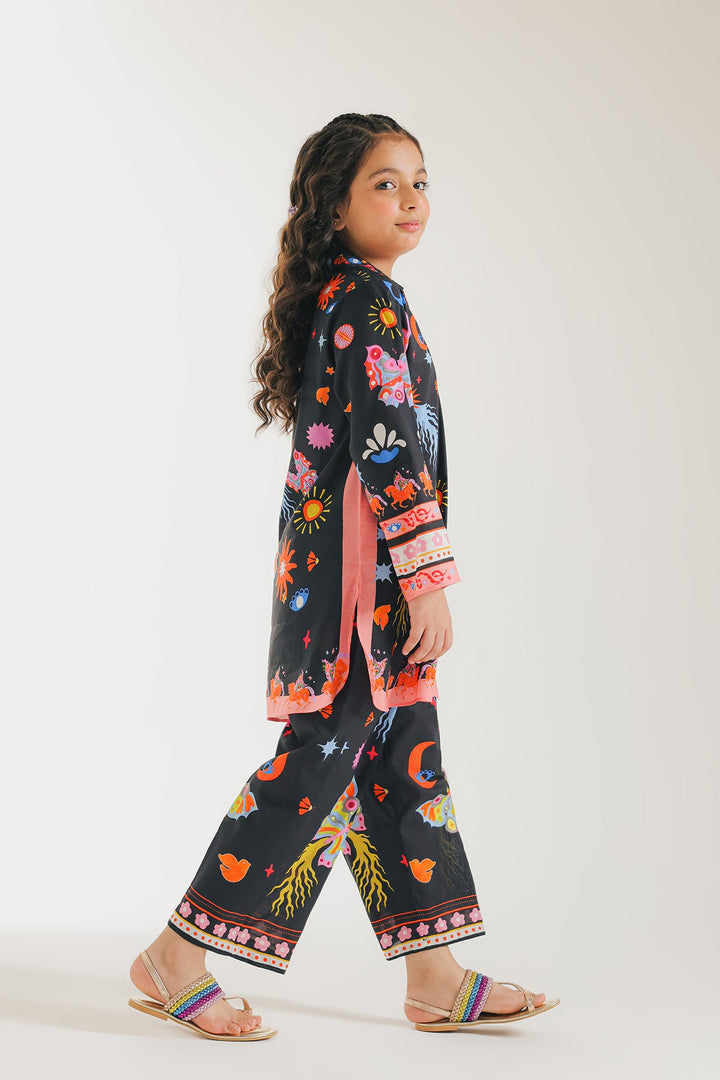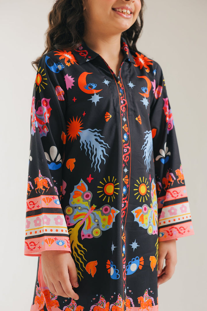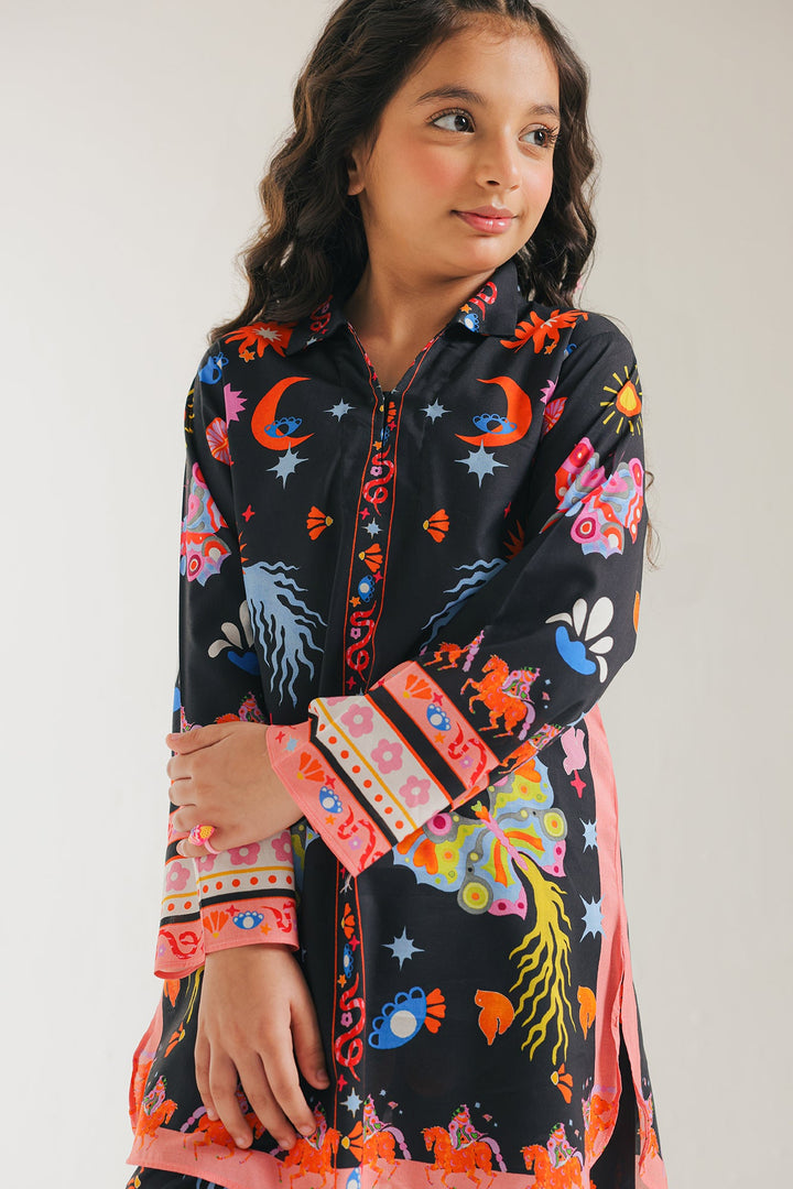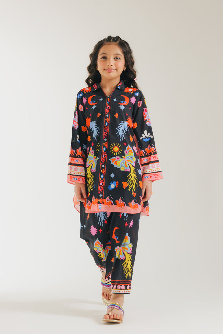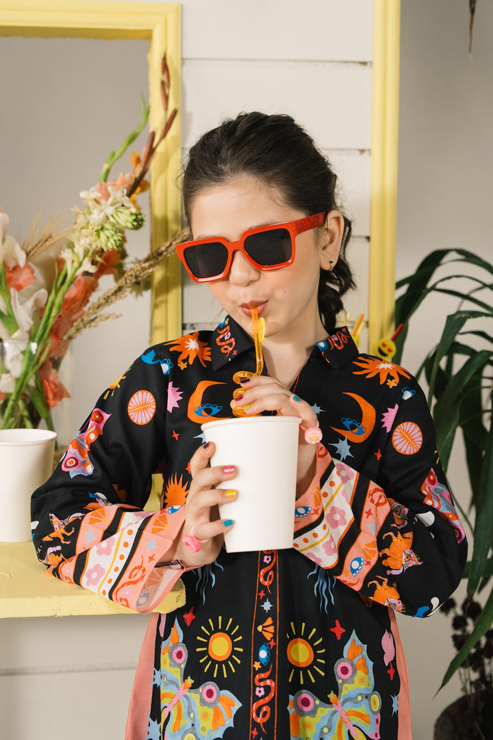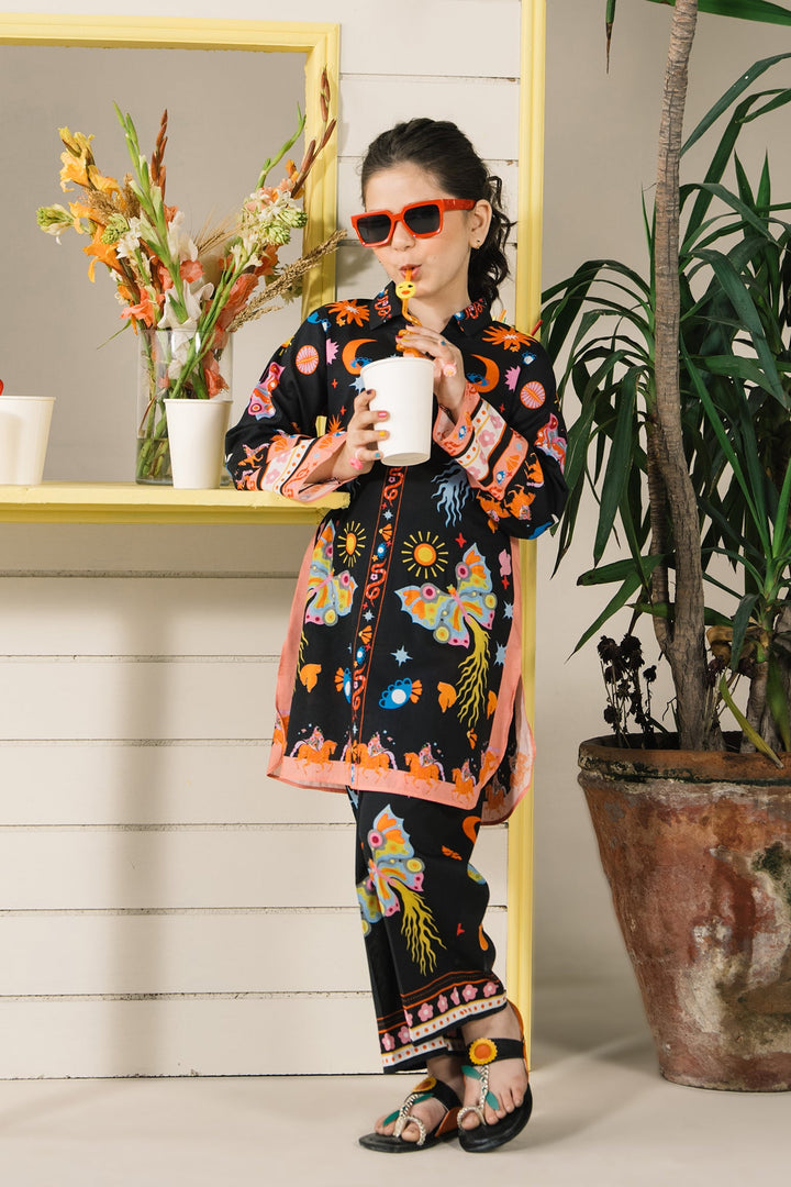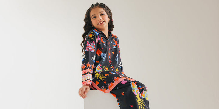 A contemporary composition is layered on this trendy silhouette shirt beautifully adorned with captivating artistic abstract designs printed in vibrant hues on a deep black canvas. Paired with a matching trouser, this style statement outfit is a perfect option for your girls to embrace this summer season.
