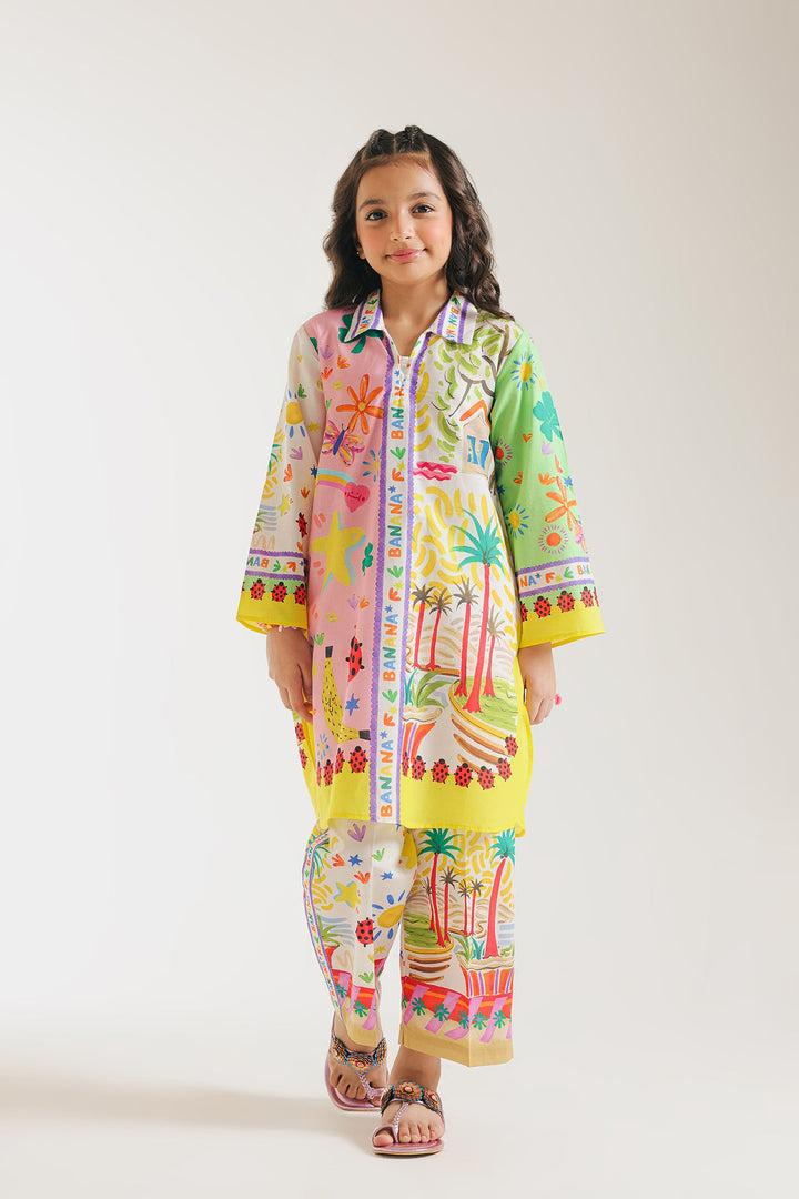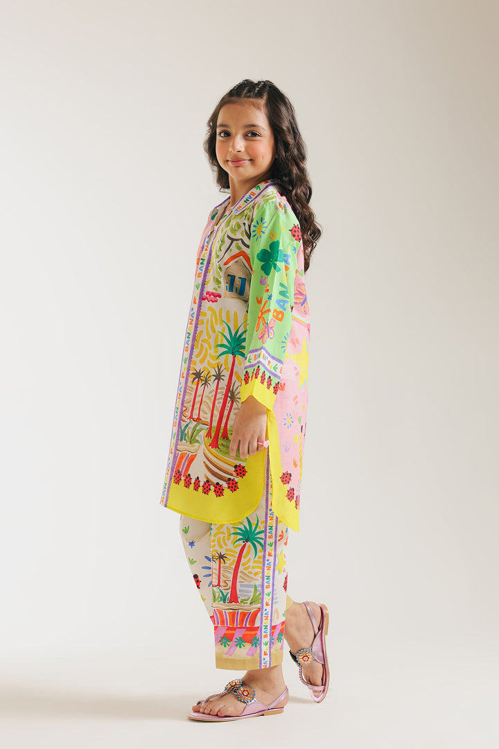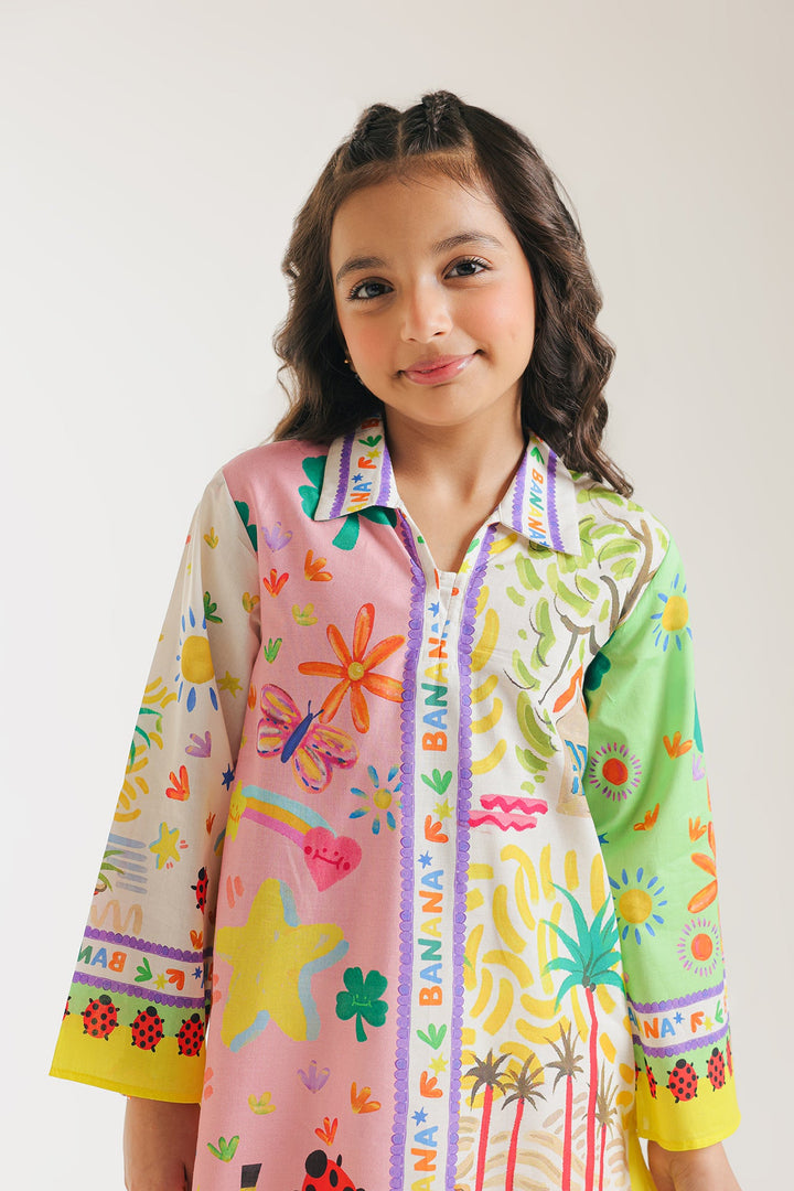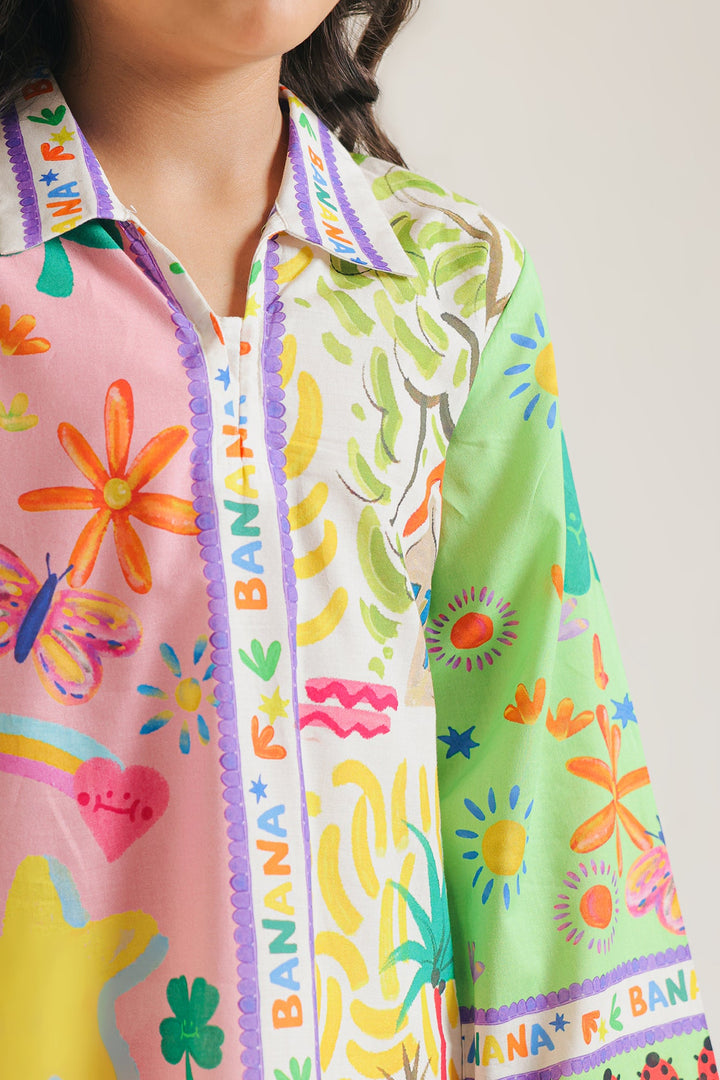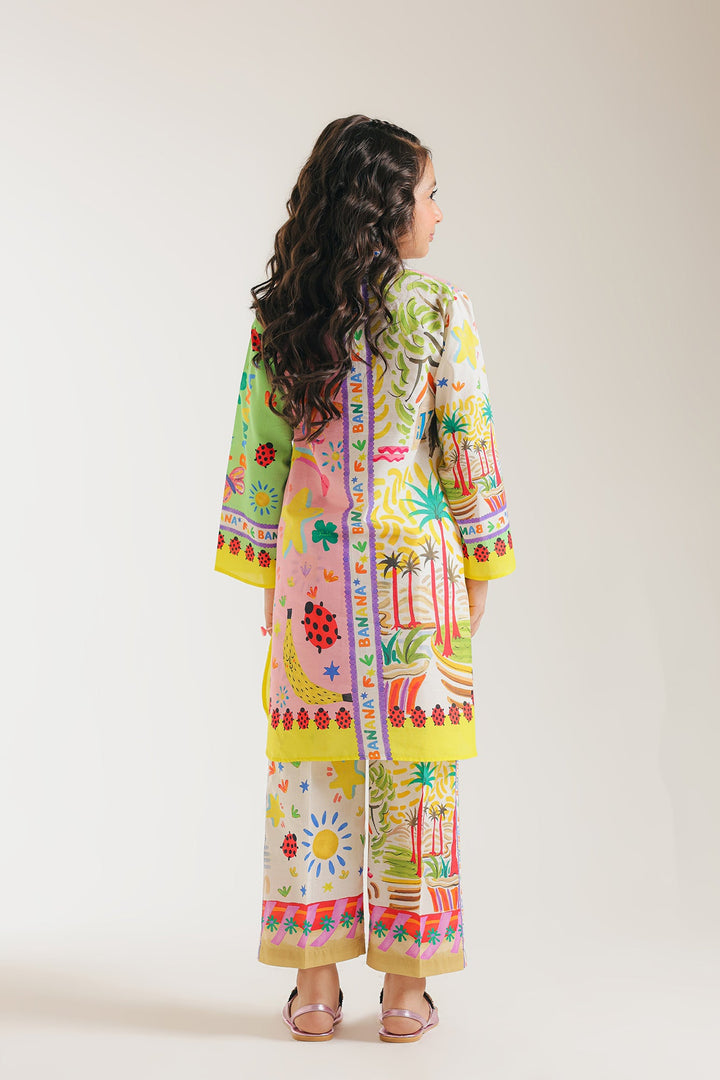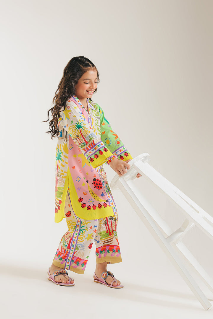 Upgrade your daughter's summer wardrobe with this sophisticated attire. This chic set boasts a modern design and captivating artistic and abstract pattern in vibrant colors, all on a classy off white canvas. The accompanying trouser enhance the look, making it a fashion-forward choice for the summer season.