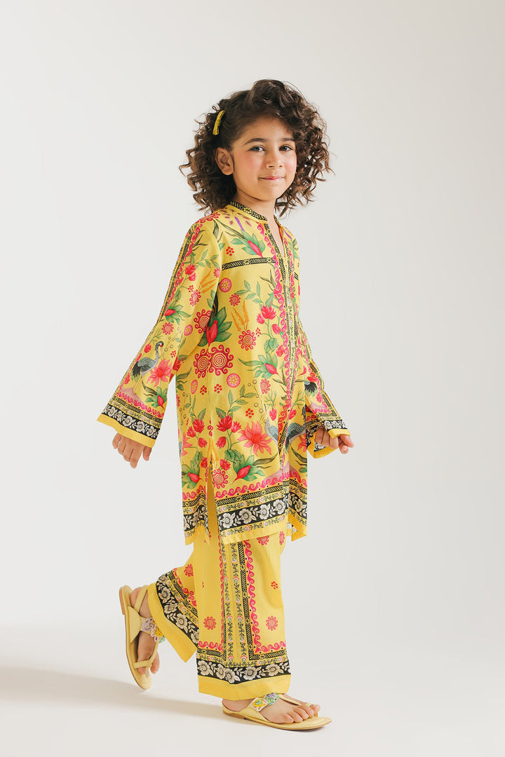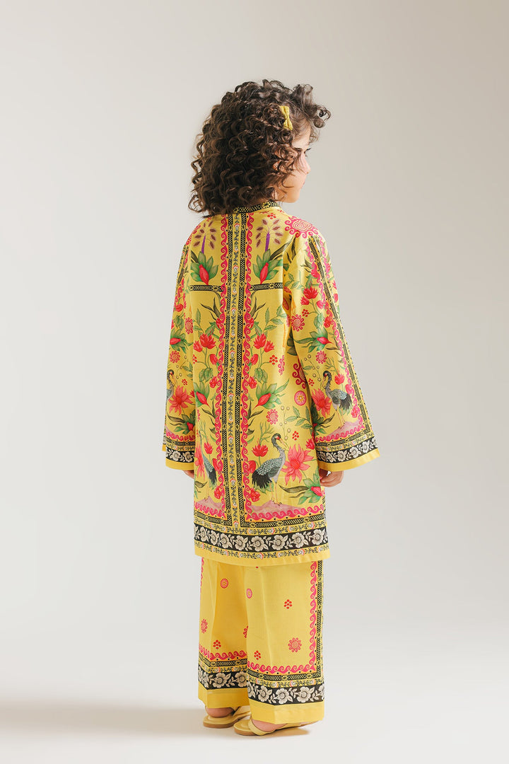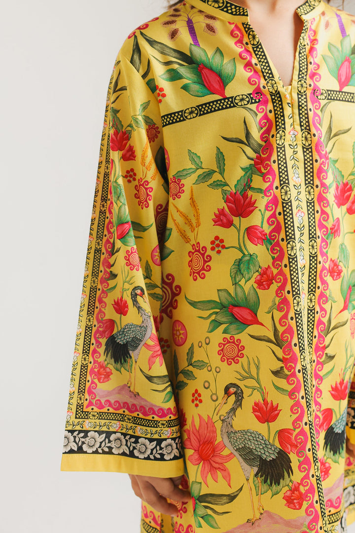 Add a vibrant pop of color to any occasion with this two-piece outfit in a sunny yellow hue. The design features graceful cranes taking flight amidst a tapestry of blooming flowers, their elegant forms brought to life against the cheerful yellow canvas. With its mandarin collar and flowing sleeves, the shirt evokes a sense of playful sophistication. The matching trousers complete this ensemble, making it perfect for creating magical moments, from festive gatherings to joyful playdates.
