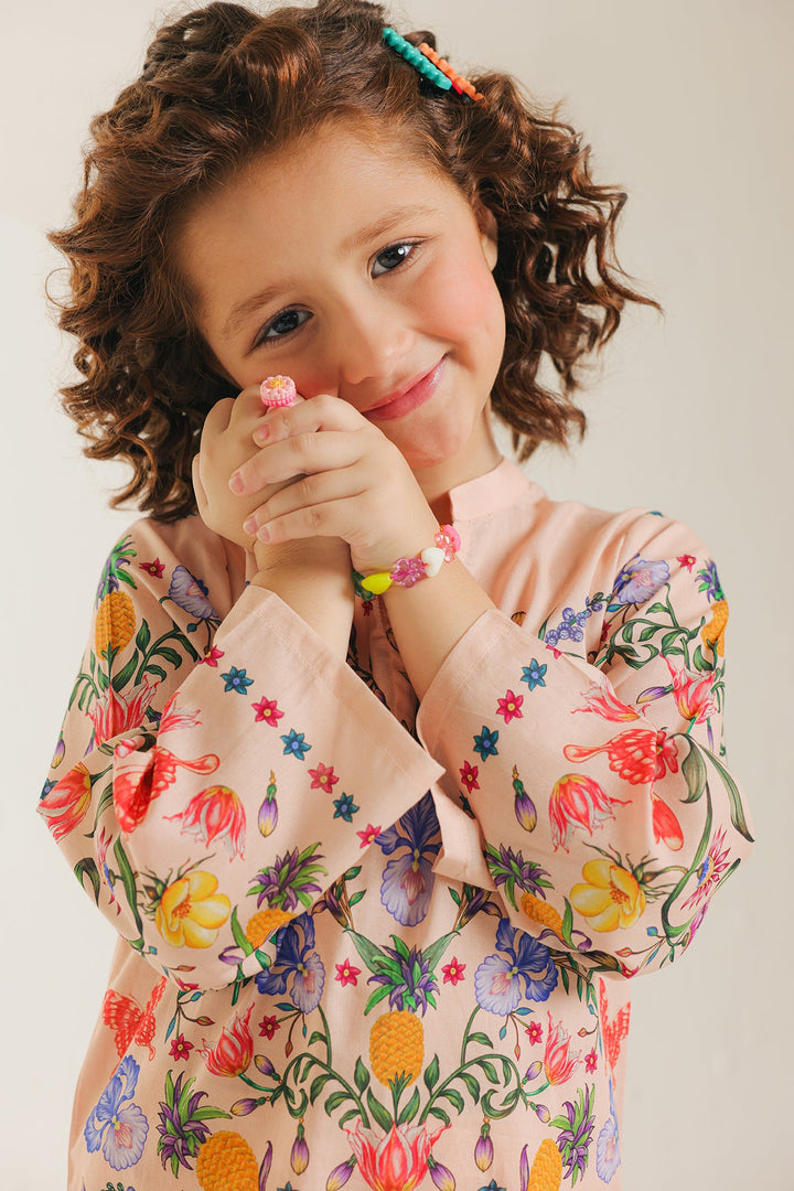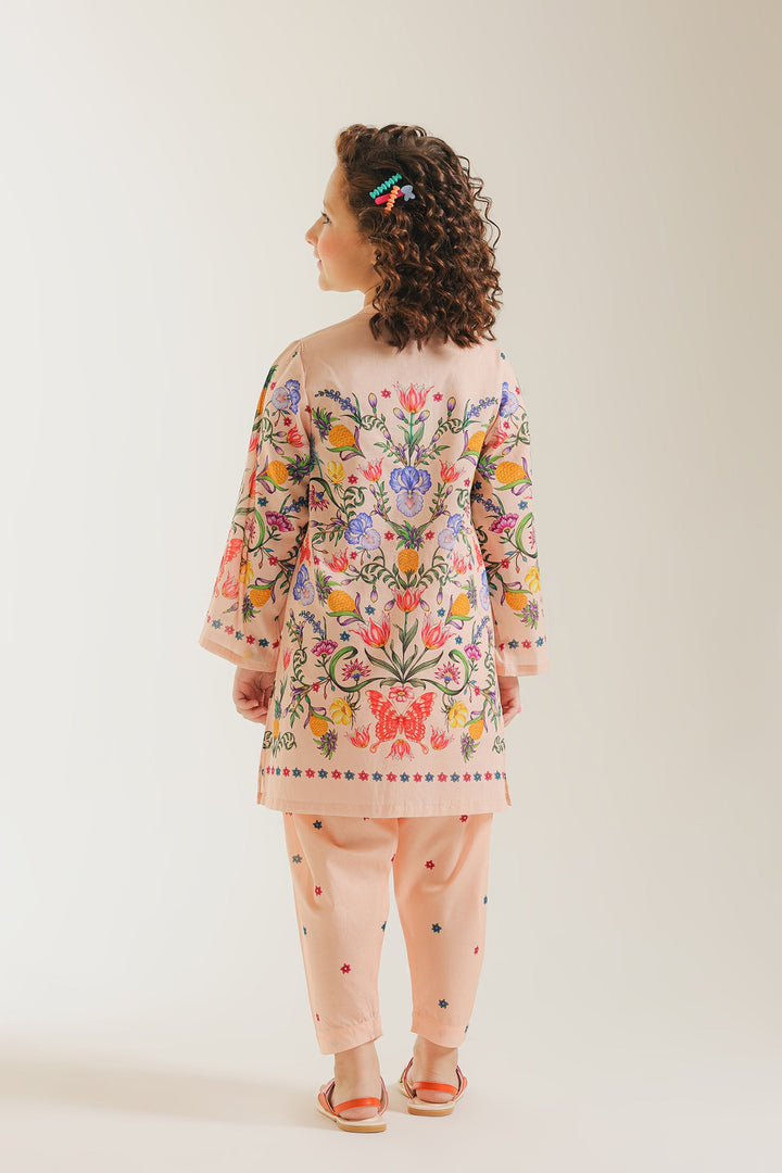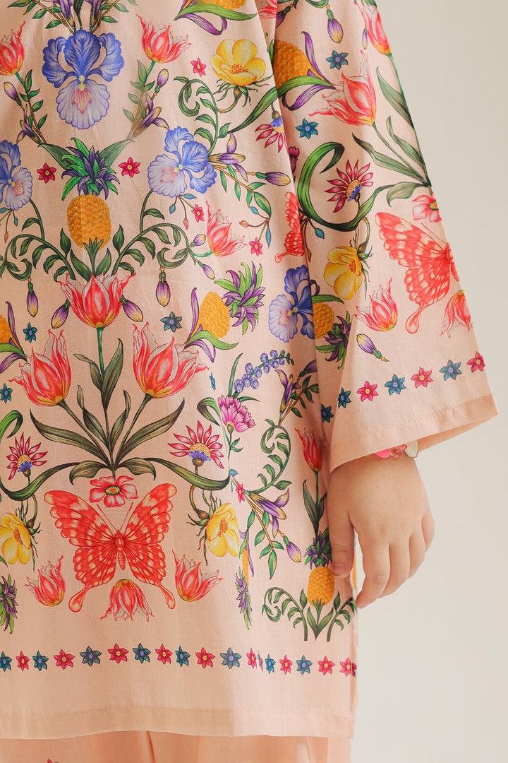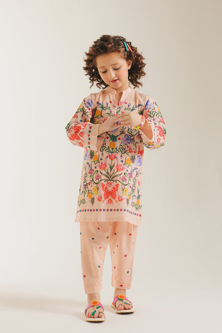 Let her imagination bloom in this enchanting peach two-piece ensemble, bursting with cheerful colors and intricate details. The delightful kurta is richly adorned with vibrant floral print, featuring charming butterflies and a medley of colorful blossoms that cascade across the body and sleeves. Paired with coordinating trousers embellished with playful tiny star motifs, this outfit offers both comfort and a touch of whimsical elegance. Ideal for playful gatherings, festive occasions, or simply adding a magical touch to her everyday adventures.