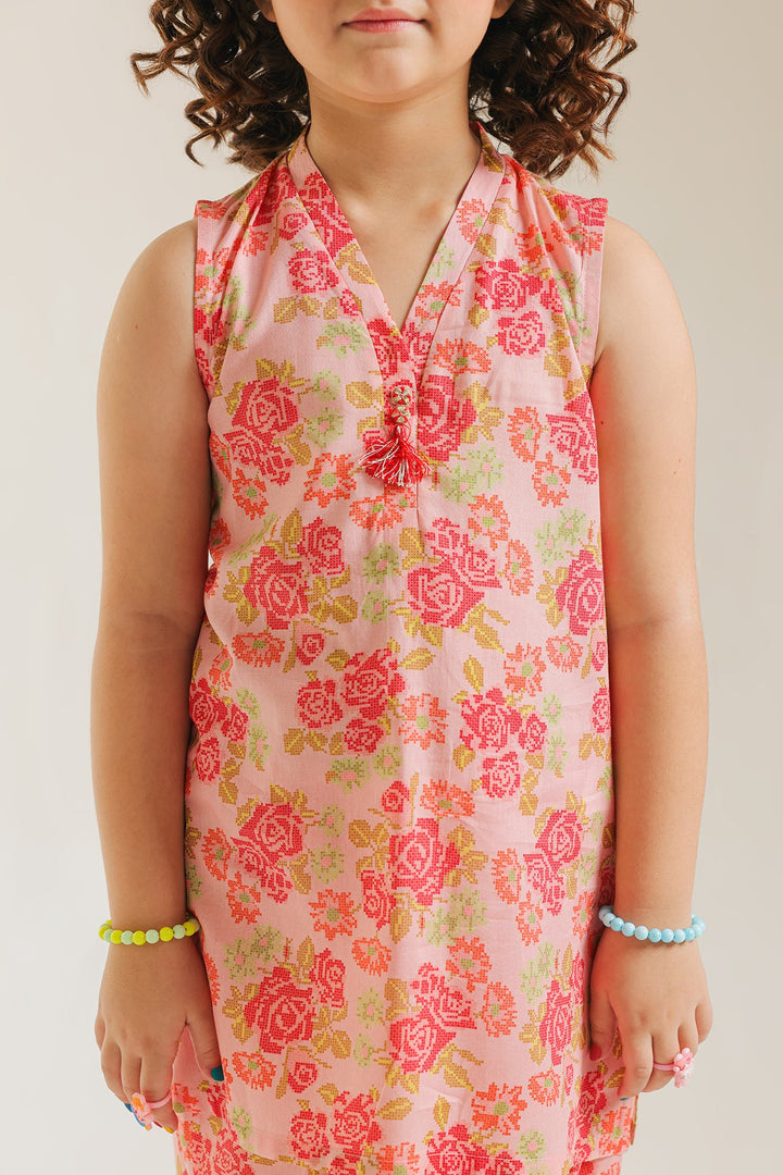 Adorn your little one in pure delight with this charming pink two-piece outfit, bursting with cheerful florals. Featuring a comfortable sleeveless top and matching trousers, this set is covered in a vibrant, all-over rose print in delightful shades of pink, red, and green. Perfect for sunny days and playful moments, it's a sweet and stylish choice for any young trendsetter.