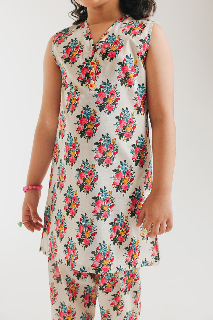 Bring a burst of color and joy to your child's wardrobe with this delightful two-piece ensemble, adorned with a vibrant and playful floral print. The sleeveless kurta and coordinating shalwar feature an all-over pattern of bright pink, blue, yellow, and green flowers against an ivory background, creating a cheerful and energetic look. This comfortable and stylish outfit is perfect for festive celebrations, casual outings, or adding a distinctive and joyful flair to your child's style.