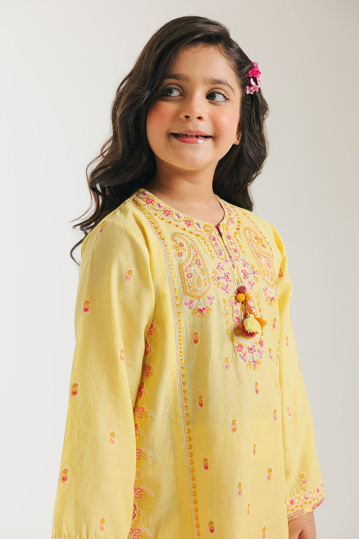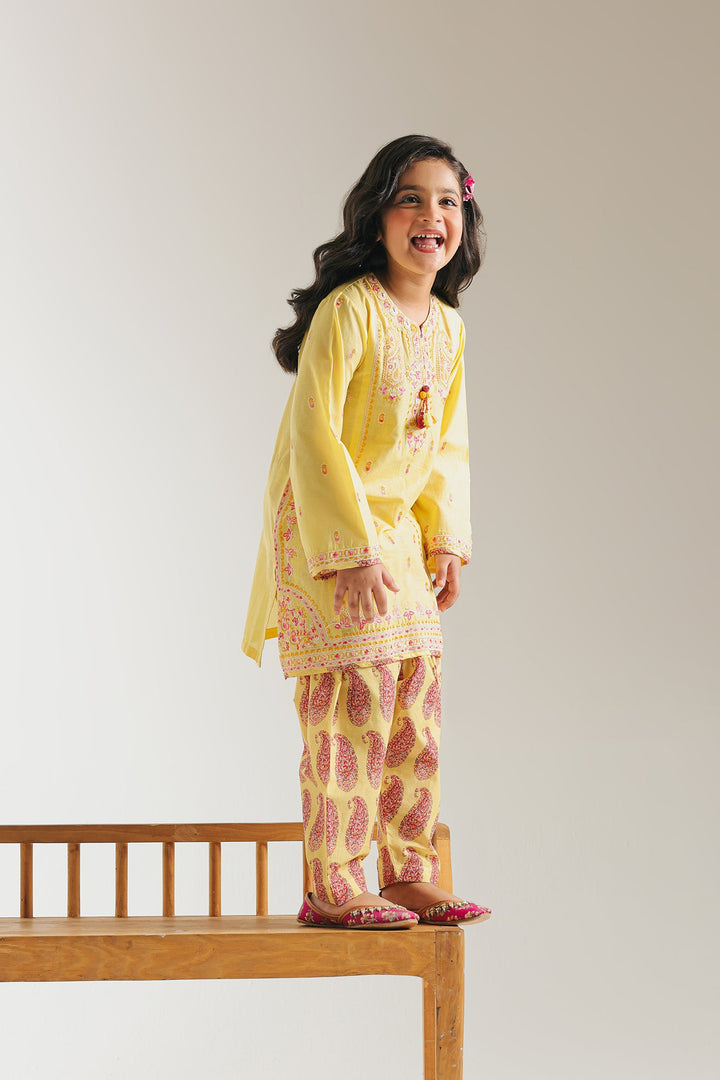 Dress her in cheerful elegance with this delightful two-piece ensemble, blooming with vibrant artistry. The kurta features intricate floral and abstract embroidery in shades of pink, white, and yellow, beautifully detailing the neckline and body, with playful tassel accents. It is perfectly complemented by a coordinating shalwar adorned with a lively all-over print in pink and yellow, creating a cohesive and traditional silhouette. This outfit is ideal for festive gatherings, cultural events, or adding a touch of joyful charm to her look.