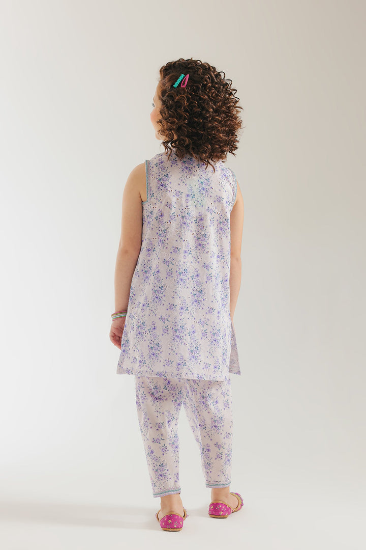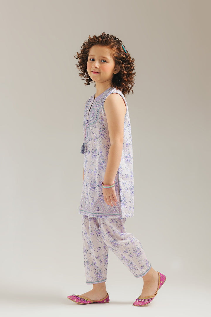 A whisper of lilac dreams, with schiffli embroidered suit is a vision of delicate charm. The soft, off-white fabric is adorned with a whimsical all-over print of tiny blue and lavender flowers. The sleeveless tunic features exquisite lavender embroidery around the neckline and hem, with intricate floral and paisley motifs. Playful tassels add a touch of bohemian sweetness. Completing this enchanting ensemble is a matching shalwar with coordinating embroidered details, creating a look that is both ethereal and effortlessly stylish.