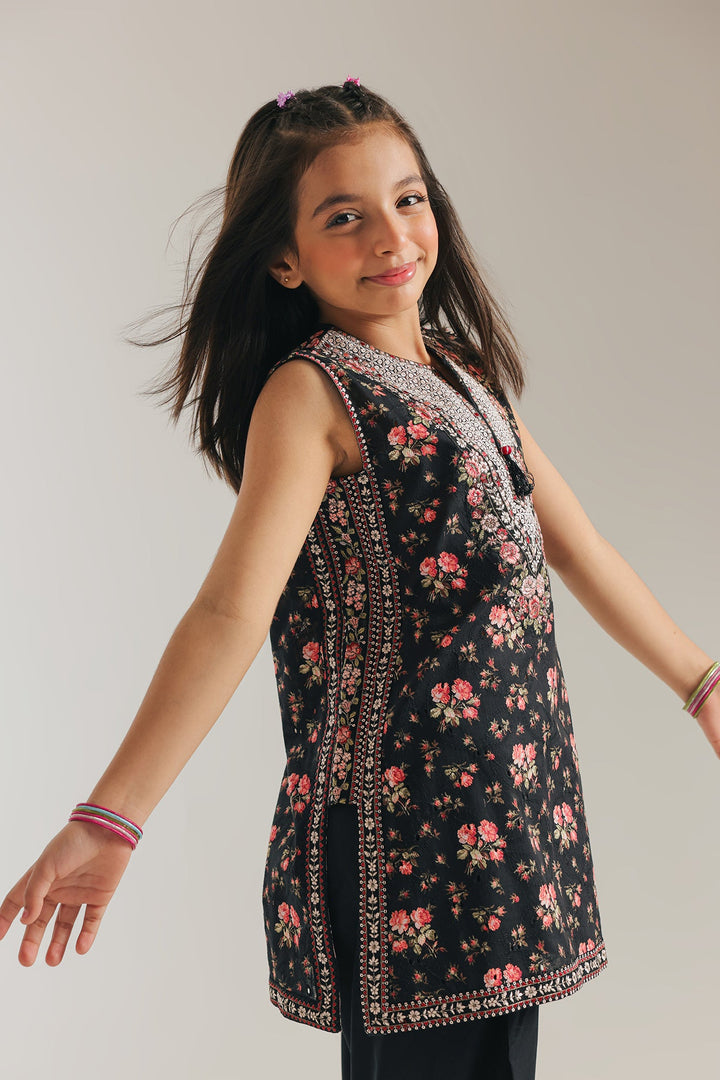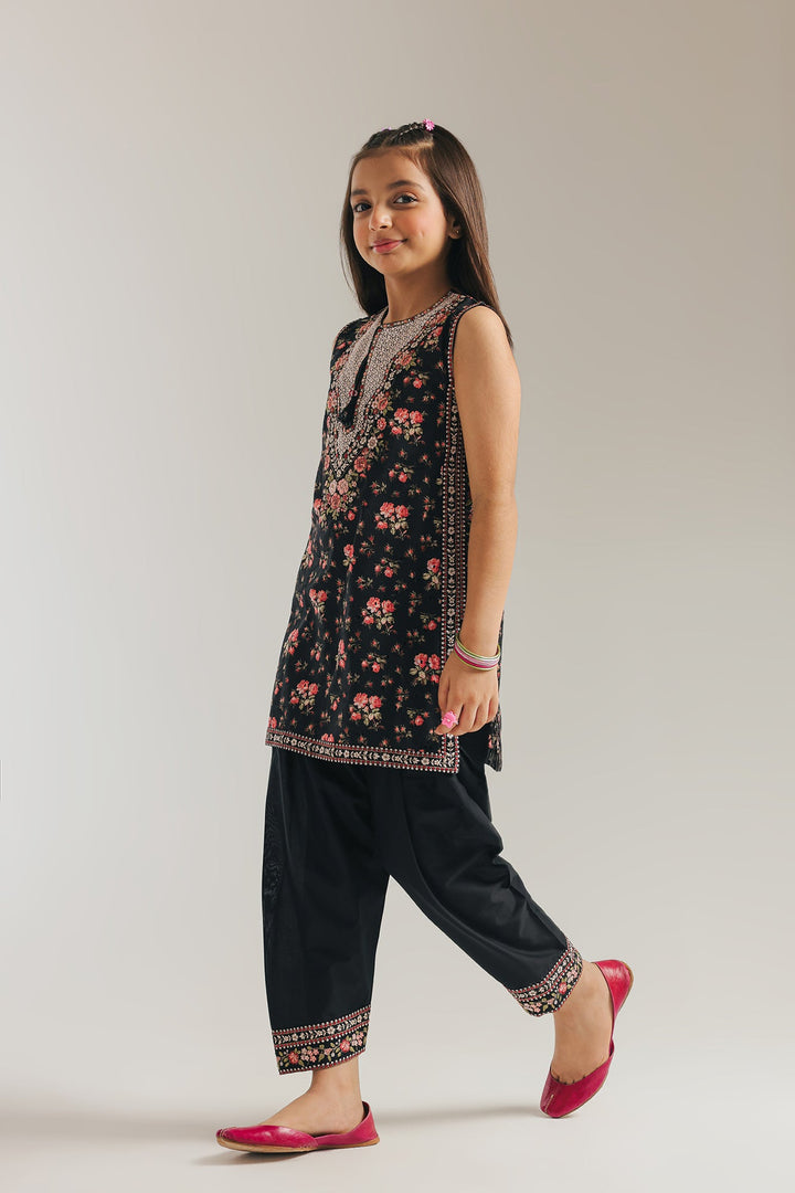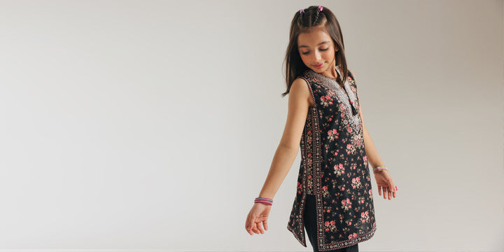 Dress them in sophisticated elegance with this stunning black sleeveless outfit. The kurta features rich, colorful floral embroidery around the neckline and bodice, showcasing intricate pink and green motifs. Paired with classic black shalwar detailed with matching embroidery, this ensemble is perfect for making a stylish statement at any celebration.