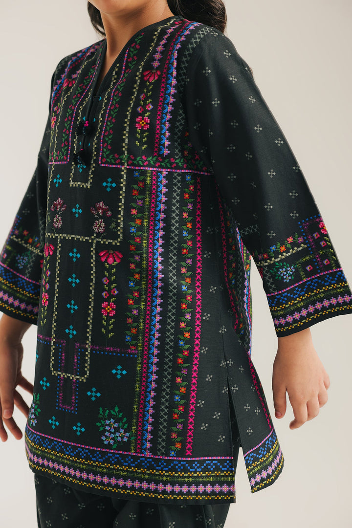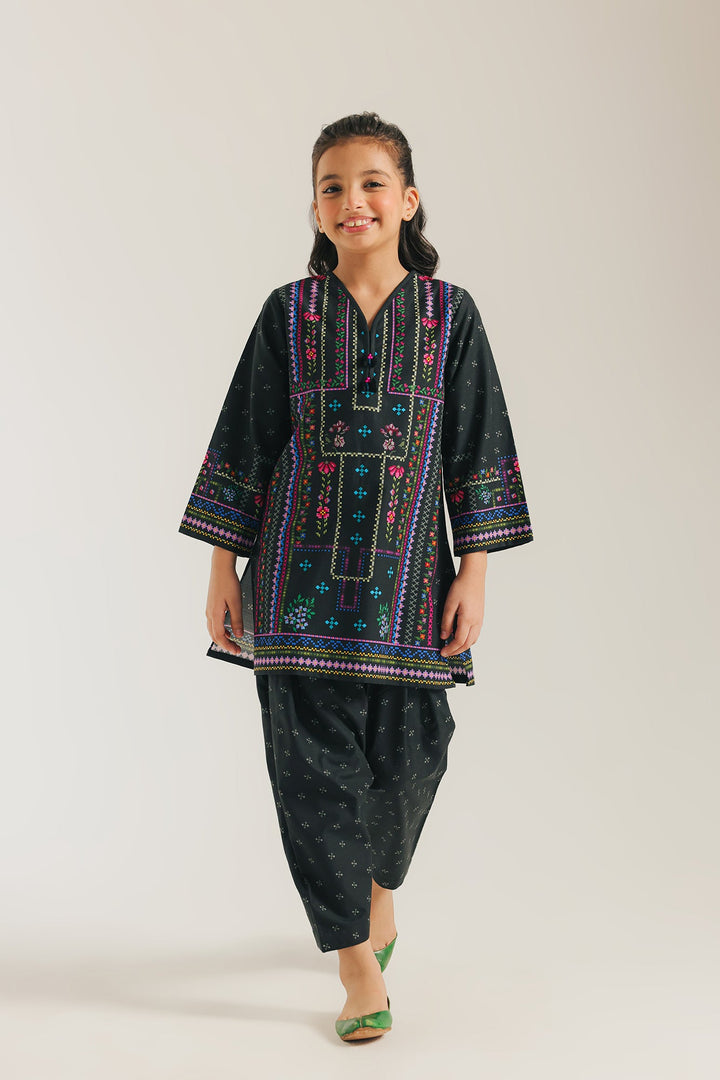 Bring vibrant charm to her wardrobe with this captivating printed suit. The black kurta is a canvas of intricate beauty, adorned with a mix of floral and geometric patterns in a spectrum of lively, multi-colored prints. Paired with a matching black shalwar that features a delicate, all-over pattern, this suit is a truly delightful and festive choice for any special occasion.