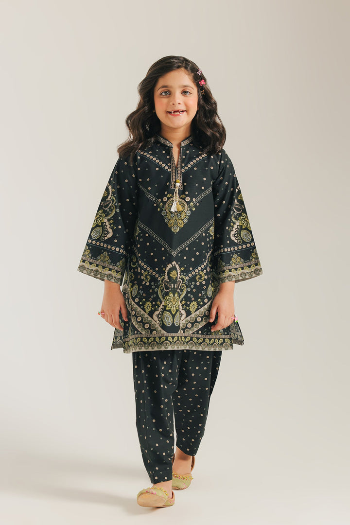 Discover a world of refined elegance with this captivating printed suit. The deep black kurta is a canvas of intricate artistry, featuring a beautiful all-over print of paisley and folk-inspired patterns in subtle shades of olive, gold, and white. Paired with a matching shalwar that has a complementary print, this suit is a sophisticated and charming choice for any occasion.