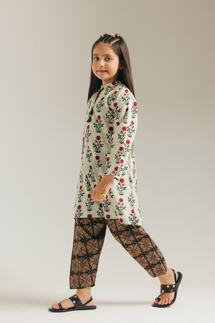 Dress your little one in this stylish printed suit, a perfect blend of traditional and contemporary flair. The shirt features a clean off-white background with a striking seamless pattern of floral motifs in a rich red and green. A classic band collar with slit adds a touch of traditional charm. The ensemble is completed with straight shalwar that showcase a geometric pattern in a beautiful dark brown and beige, providing a sophisticated contrast. This suit is an excellent choice for a playful yet polished look.
