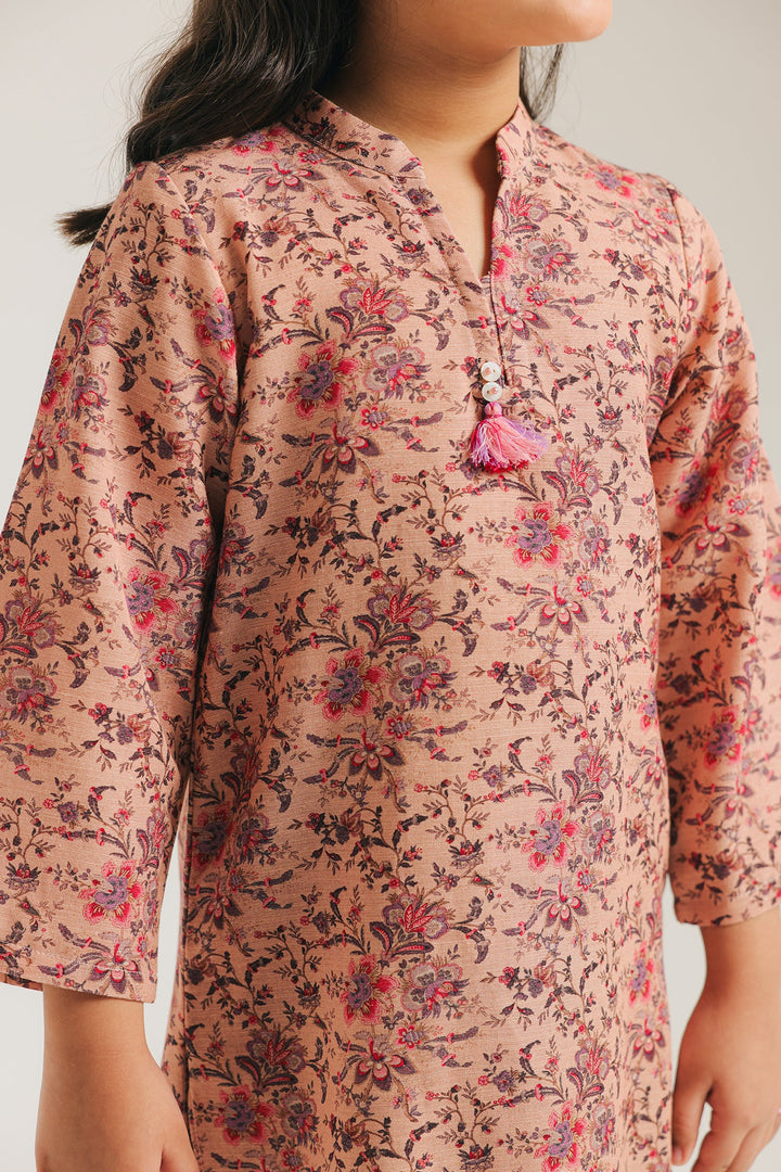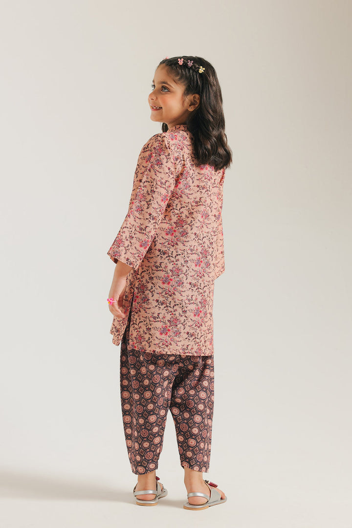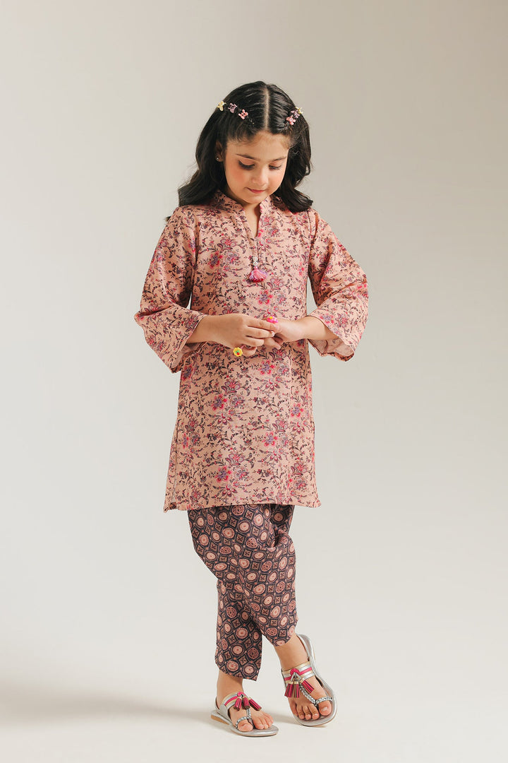 Dress her in this lovely printed suit for a look that's both traditional and stylish. The ensemble features a charming lilac-mist shirt with an all-over floral print and a sweet tassel detail at the neckline. It's perfectly paired with contrasting printed shalwar, which add a touch of playful pattern. Made from a comfortable and breathable fabric, this suit is ideal for festive gatherings or family events.
