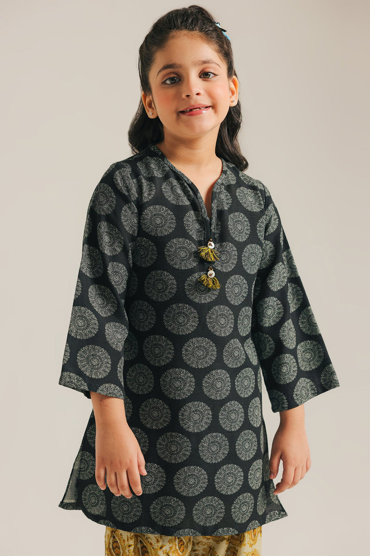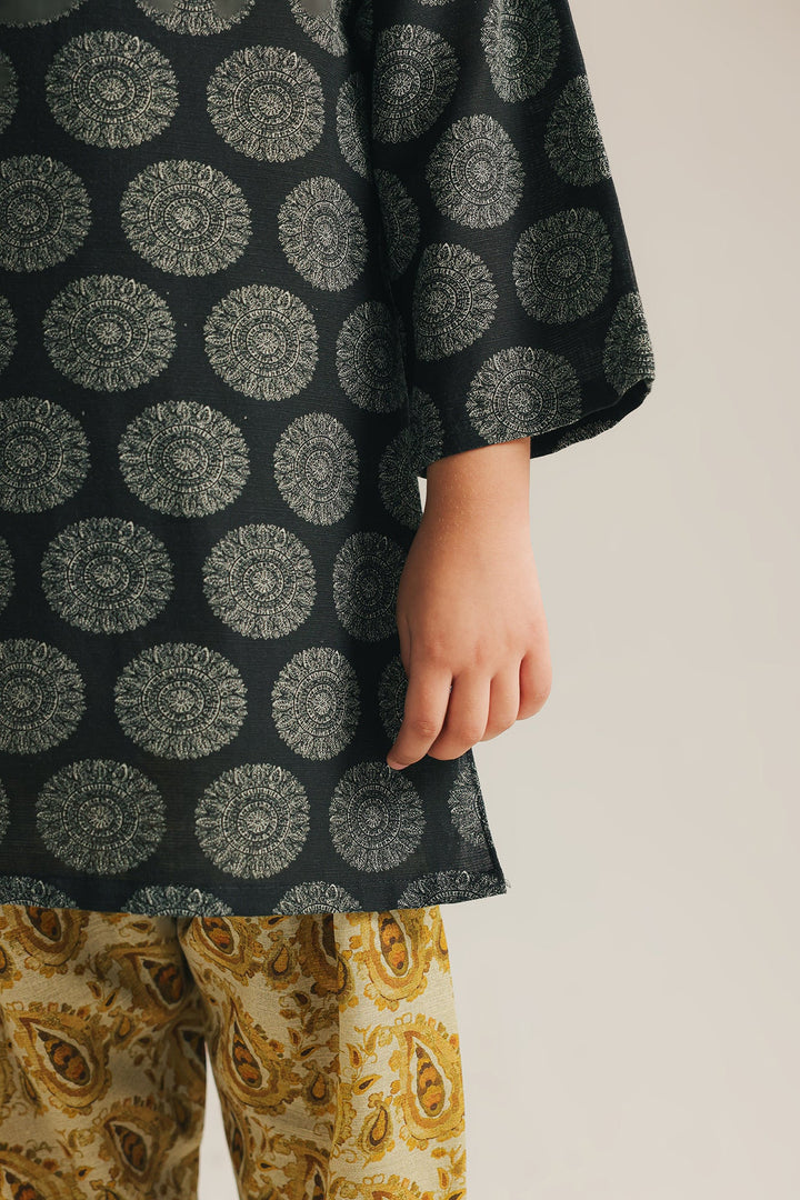 This stylish printed suit is a perfect study in contrast. The deep black kurta is adorned with a captivating all-over print of intricate circular patterns, creating a modern and sophisticated look. It is paired with a beautifully contrasting beige shalwar that features a delicate golden paisley print. This ensemble is a truly unique and elegant choice.