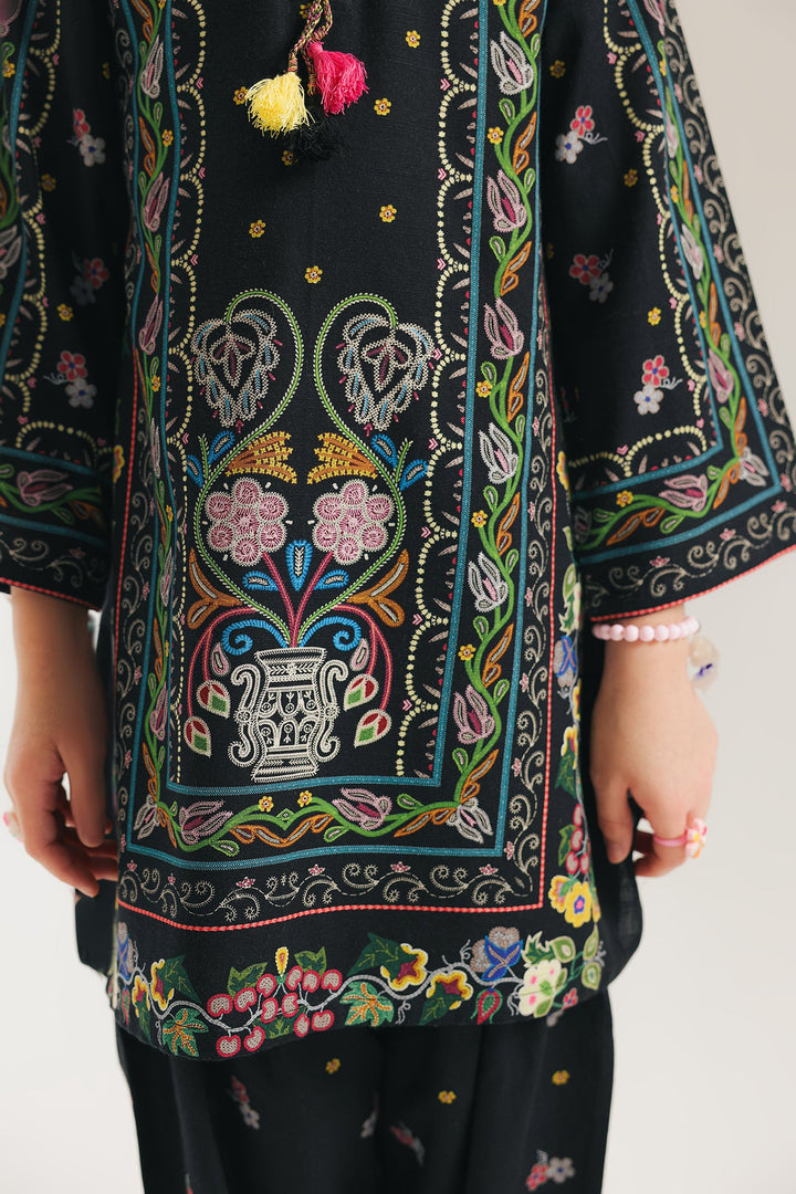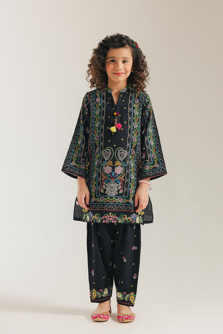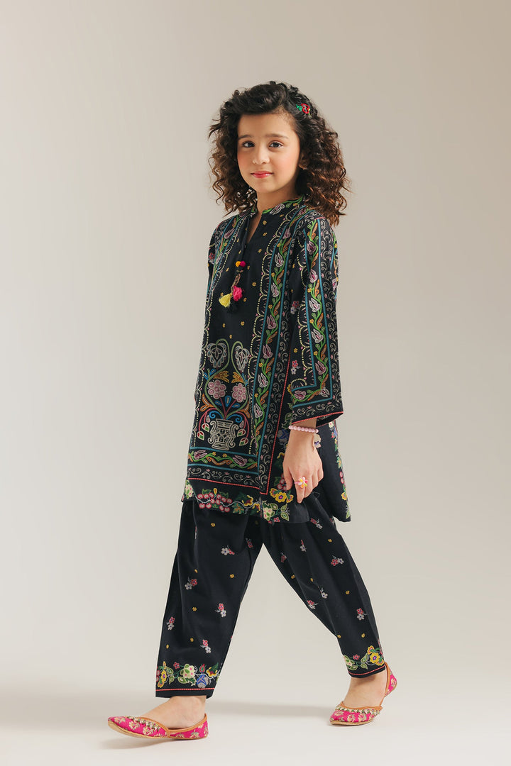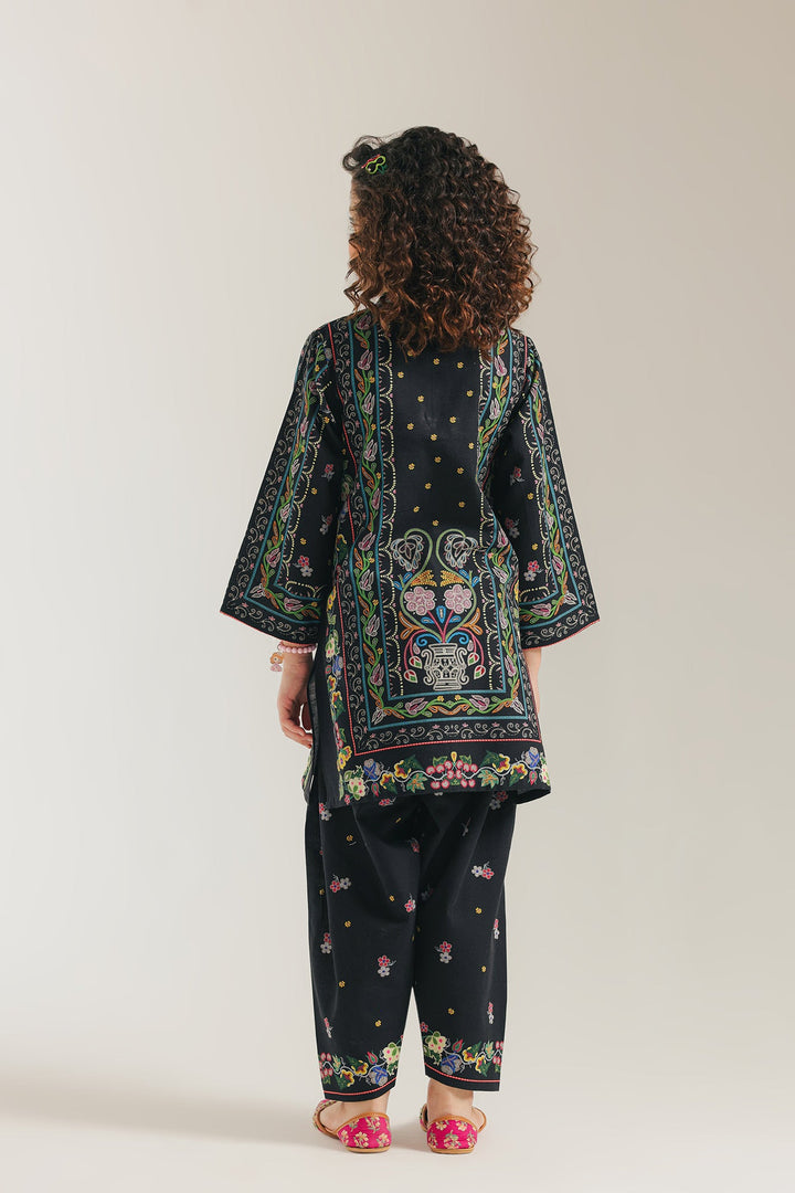 Adorn her in this beautiful black printed suit! This charming two-piece set features a kurti with a rich and colorful floral and peacock print, creating a stunning and artistic design. The suit is completed with matching shalwar that have a scattered floral pattern, making this a perfect ensemble for a festive occasion or a stylish day out.