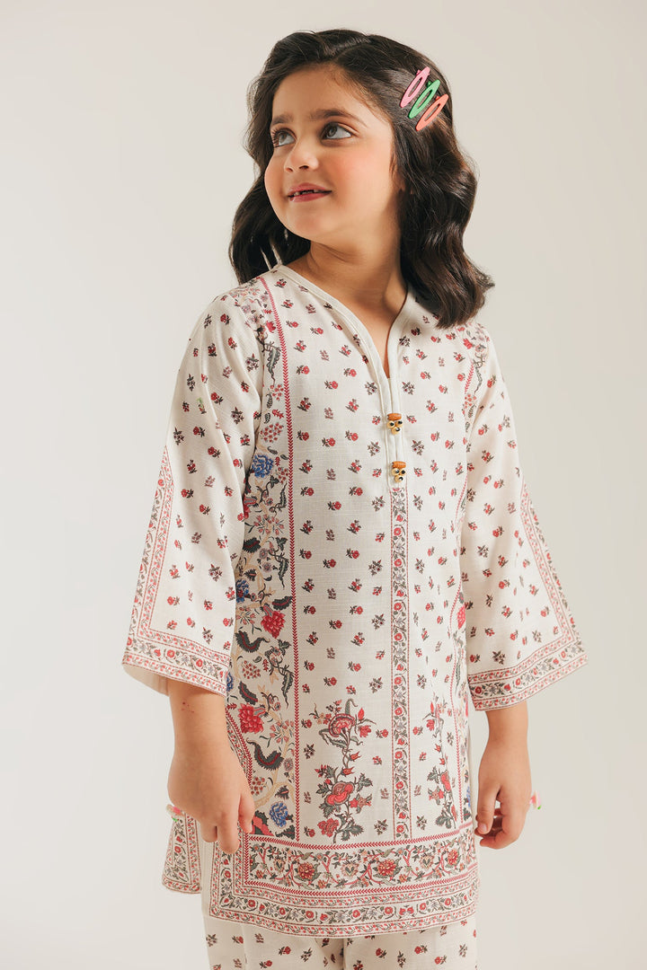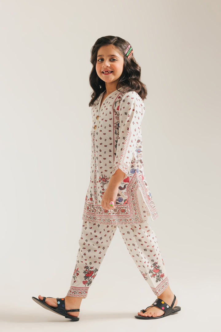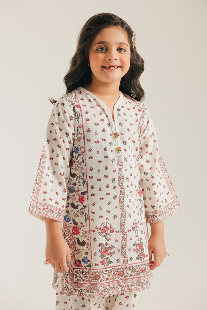 This charming printed suit is a perfect blend of delicate colors and classic style. The soft, off-white kurta features a beautiful all-over print of intricate floral and botanical motifs in subtle shades of pink, blue, and green. Paired with a matching printed shalwar, this suit creates an effortlessly elegant and timeless look.