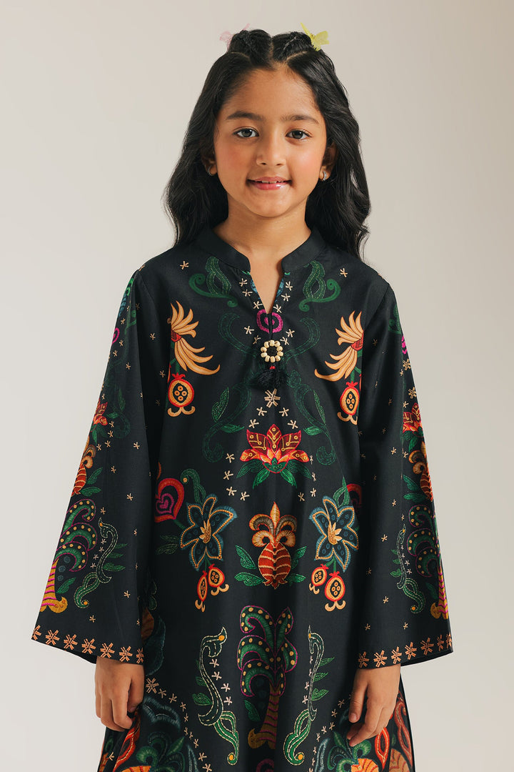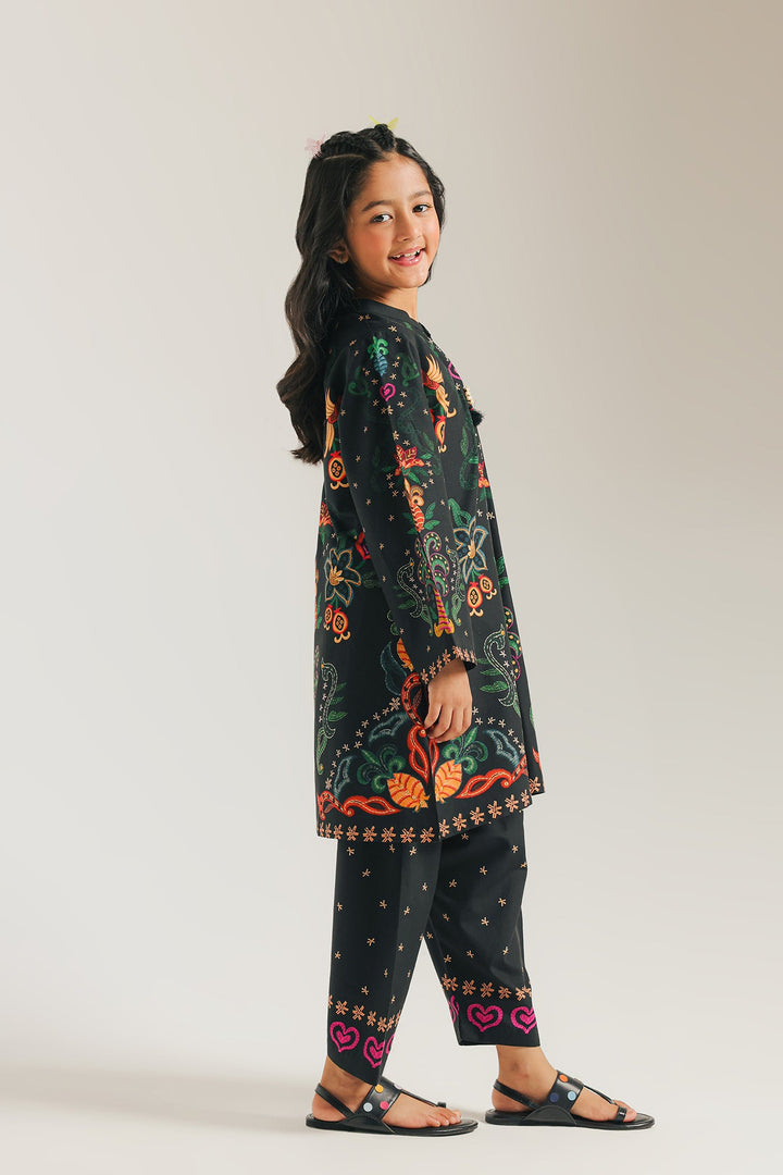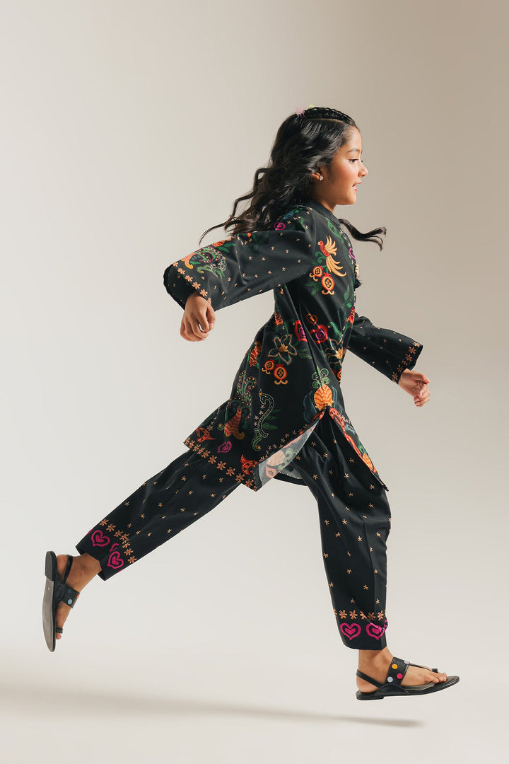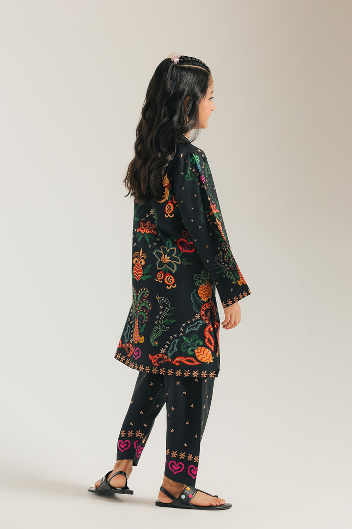 Step out in vibrant style with this striking black printed suit! The kameez is a celebration of color, featuring a beautiful and intricate floral pattern in bright, eye-catching hues. The matching shalwar is detailed with charming star motifs along the bottom, creating a cohesive and festive look. This suit is perfect for adding a pop of color to any event, blending traditional style with a modern, artistic flair.