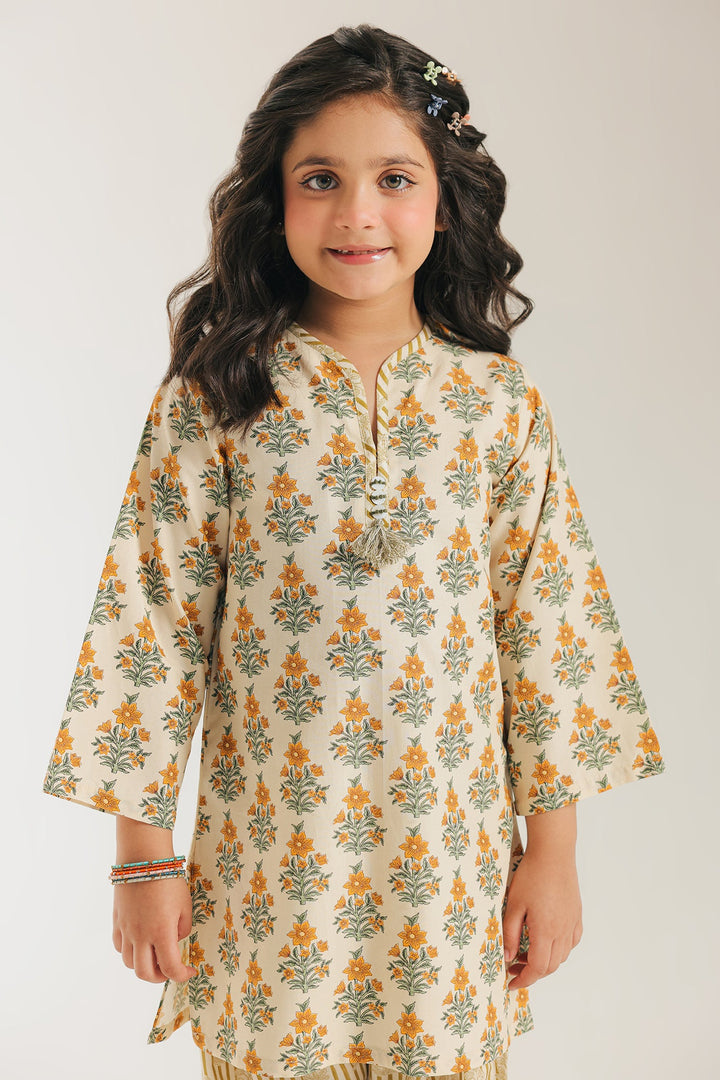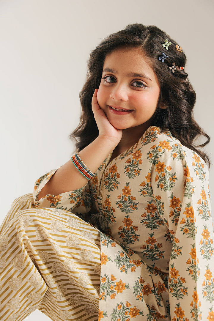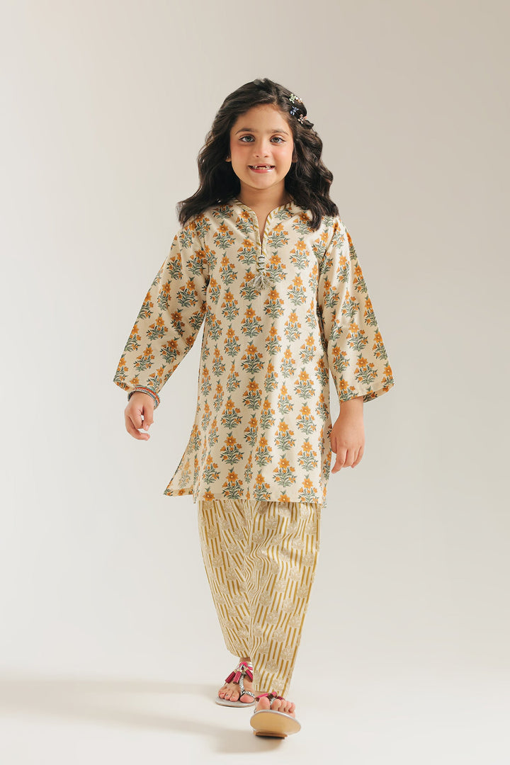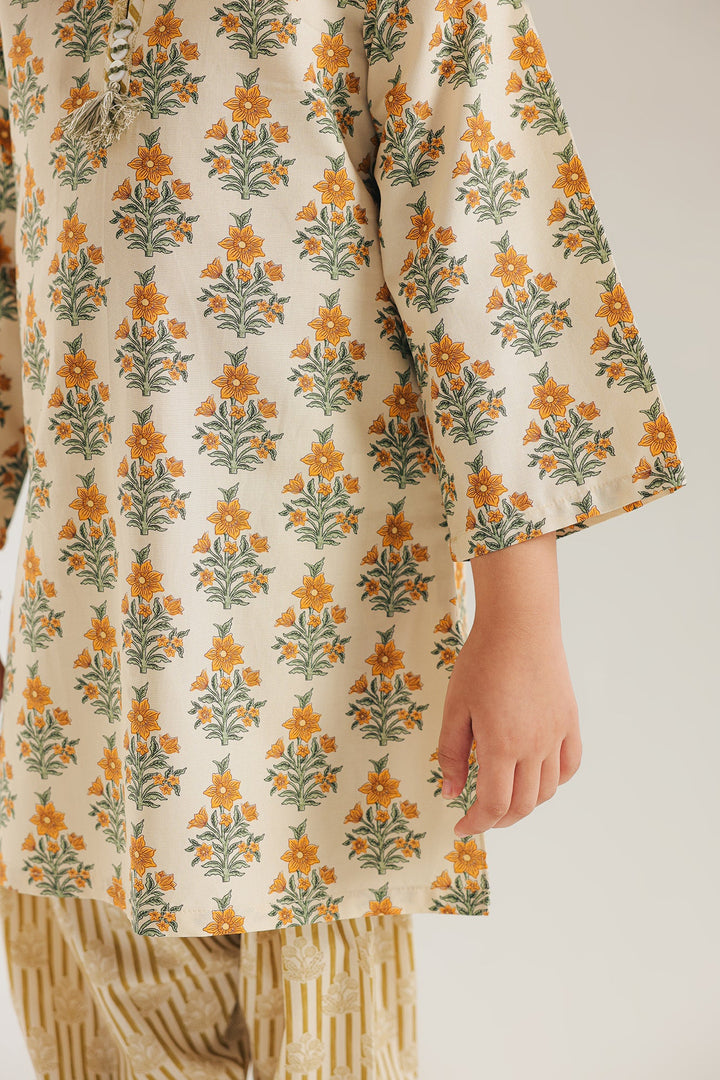 The shirt features a delicate floral pattern in a beautiful blend of white and yellow, with a classic round neckline. The vibrant shirt is perfectly complemented by the shalwar, which showcase a fun striped print. This outfit is designed for both comfort and style, making it an excellent choice for any occasion.