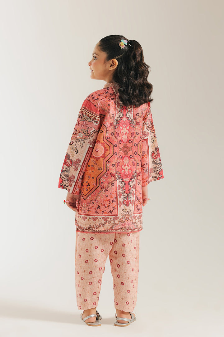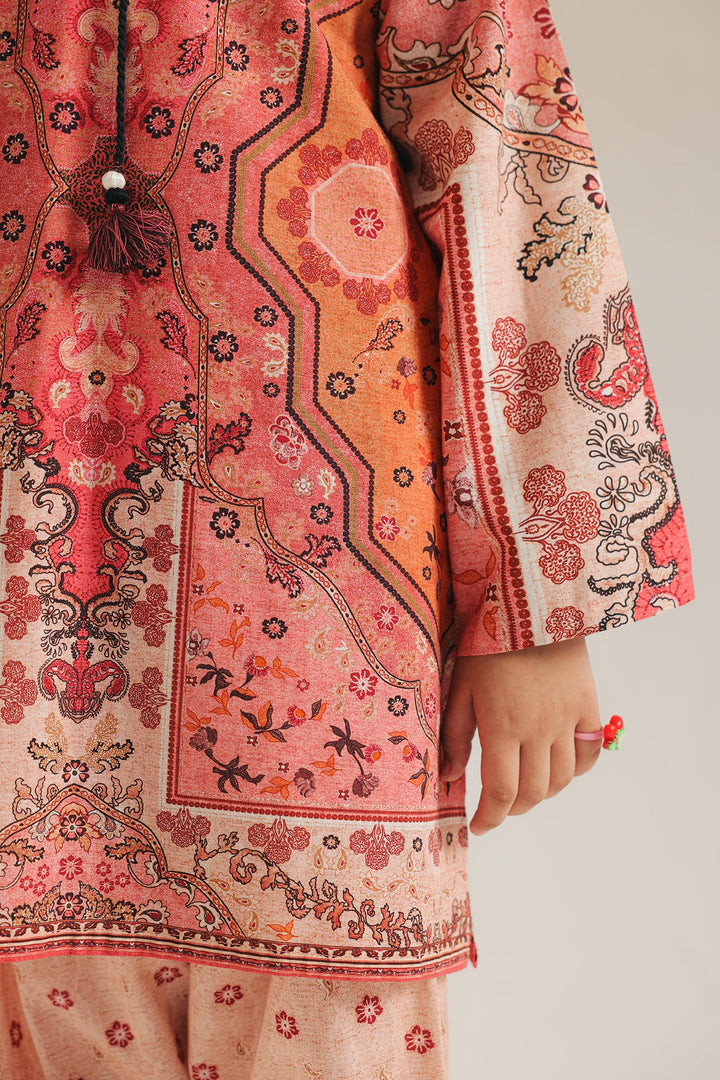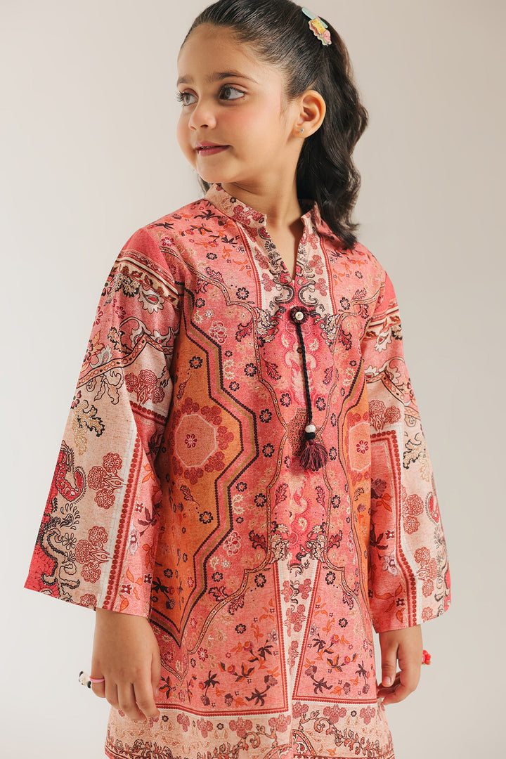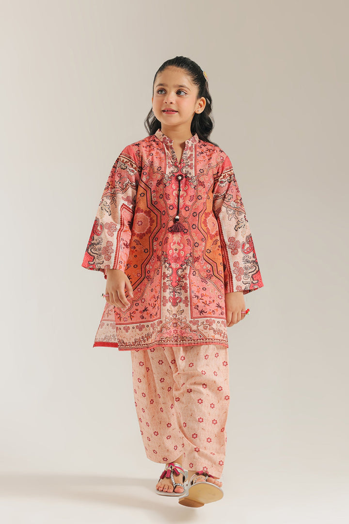 This delightful two-piece printed suit features a stunning array of designs in shades of peach, pink, and orange. The long shirt boasts a beautiful bohemian-inspired print with delicate tassels at the neckline, creating a whimsical and charming look. It is perfectly paired with complementing printed shalwar that tie the whole outfit together. This suit is an ideal choice for any occasion, offering a stylish and comfortable option for your little one.