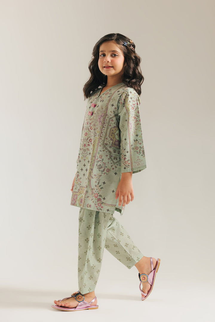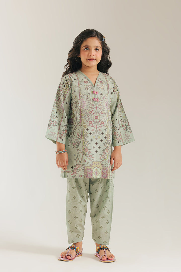 The shirt features a delicate, intricate print in soft, muted tones of green and subtle pinks. The classic V-neckline with decorative accents and the flowing sleeves add a graceful touch. The outfit is completed with complementing shalwar that have a matching print. This suit is perfect for any occasion, offering a stylish and comfortable option for your little one.
